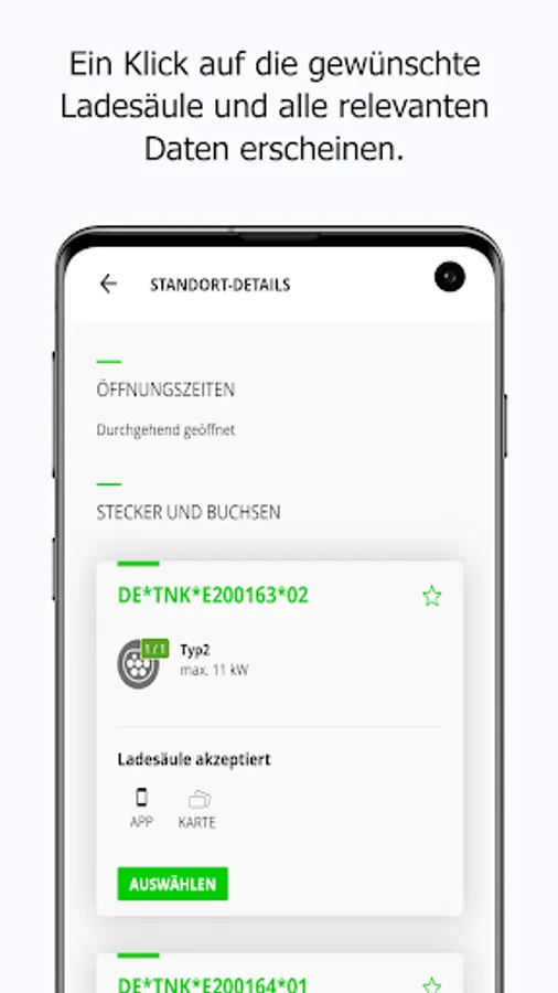 - Live display of all available charging points in the TE network as well as charging points of connected partners