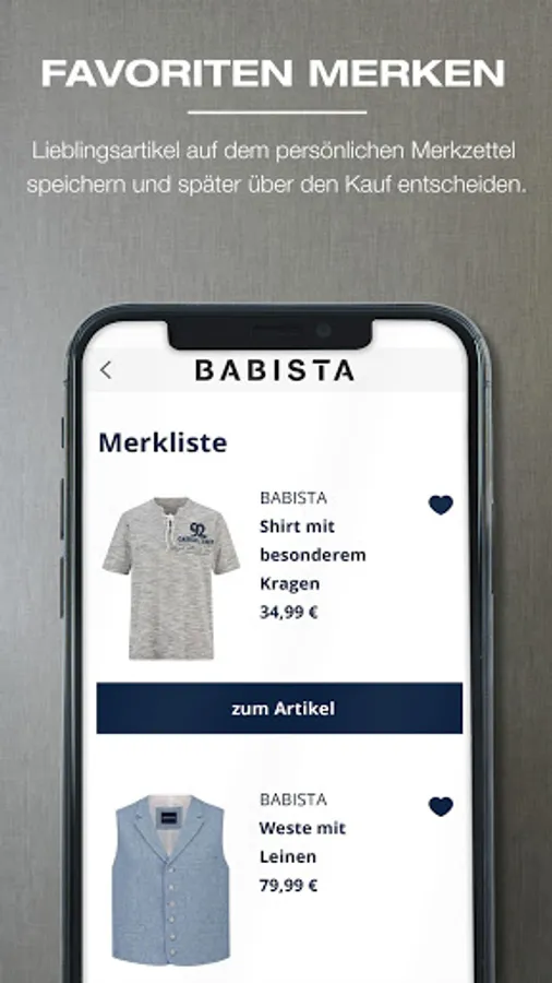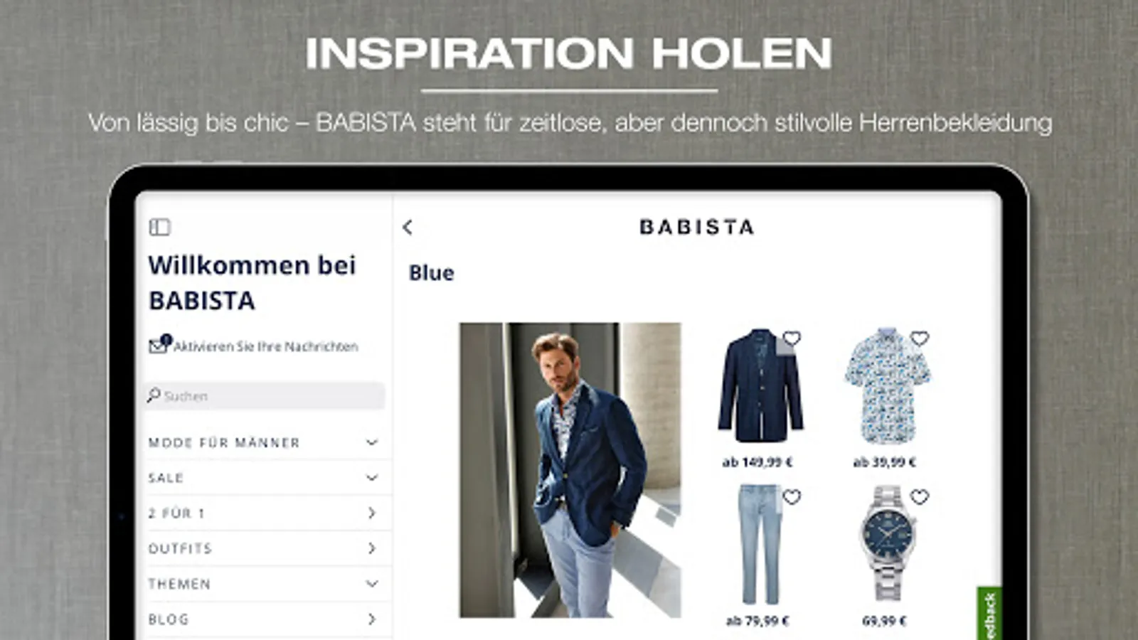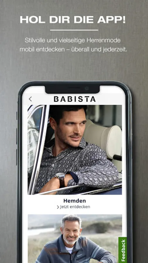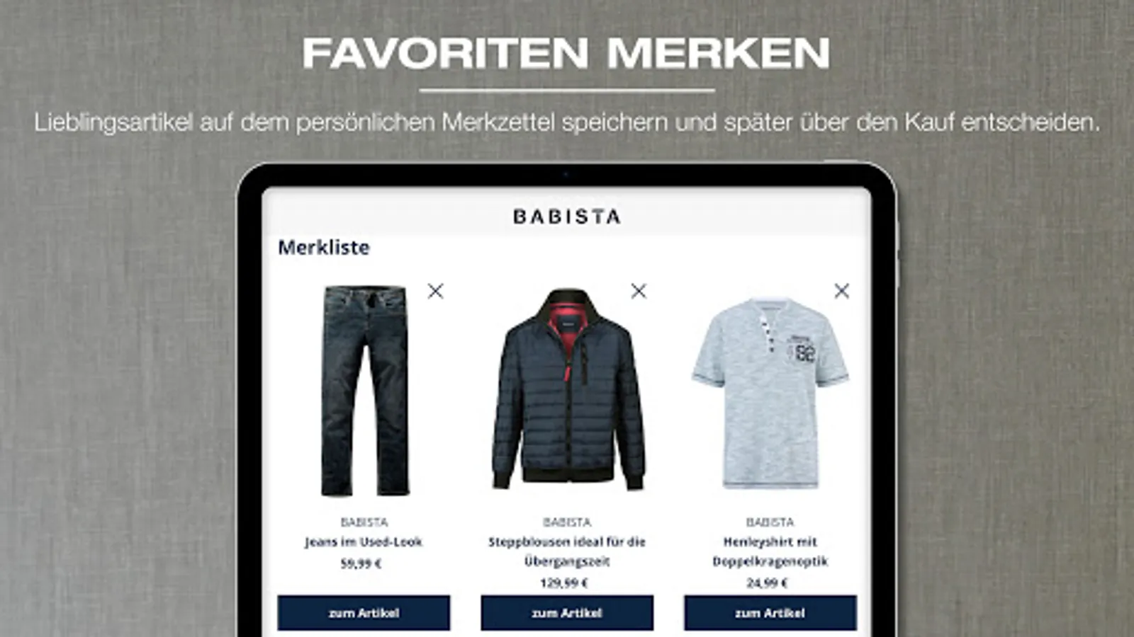 With the free BABISTA app you always have our complete shopping and service program at hand. Click through the stylish BABISTA range quickly and conveniently on your smartphone or tablet, never miss any discount campaigns and easily order your fashion favorites - around the clock, at home or on the go!