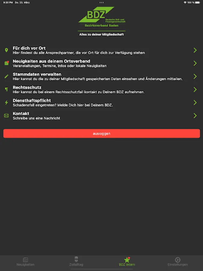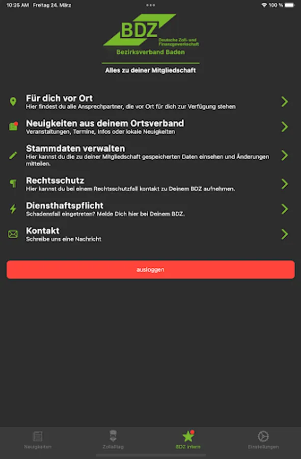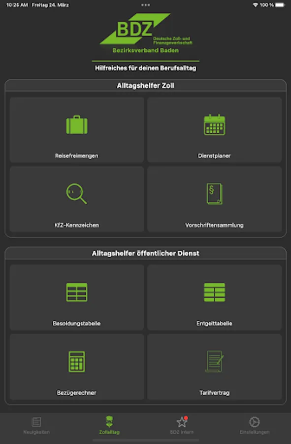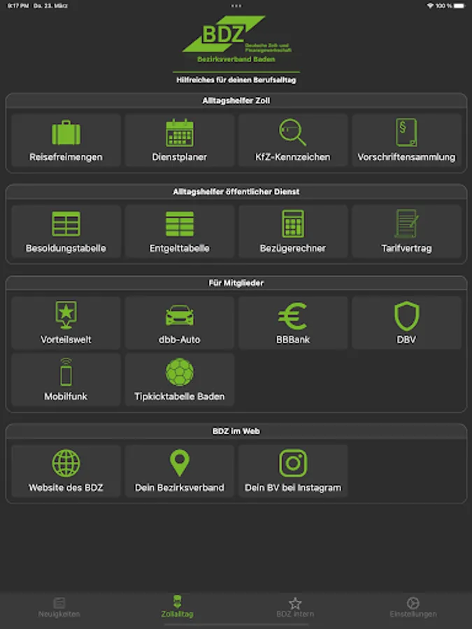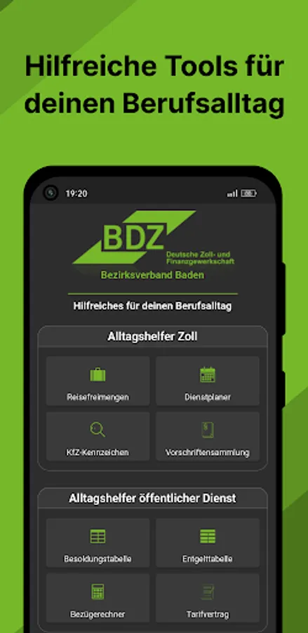 The app contains links to the content of the website www.zoll.de or shows excerpts of it. However, the "BDZ Baden" app is not an official customs app, but an exclusive app from the Baden district association of the BDZ trade union. The app expressly does not represent the customs administration or any other authority.