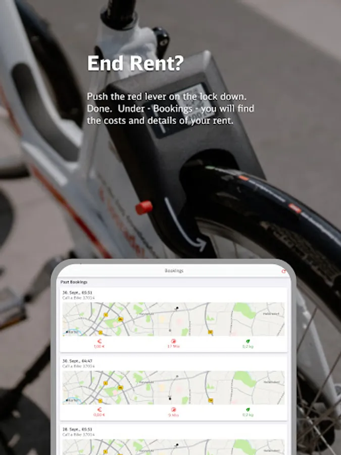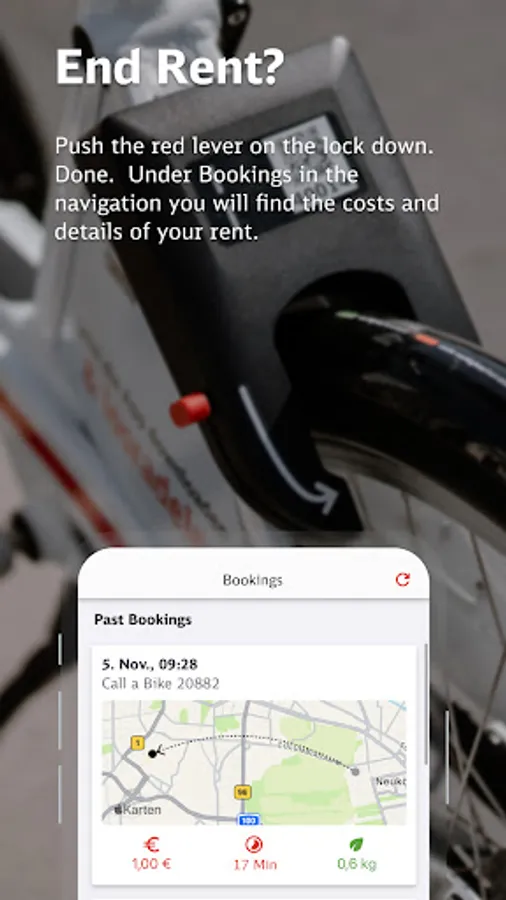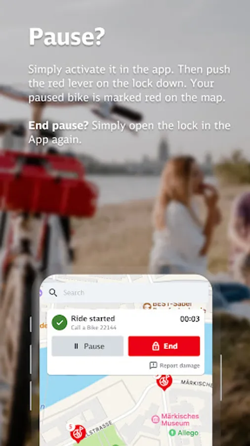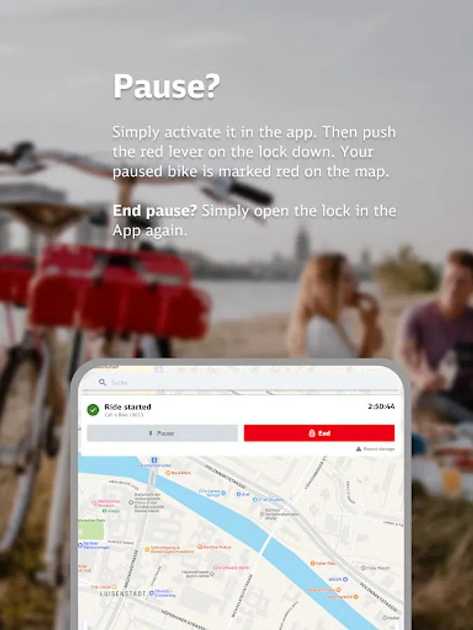 Now you can pause a ride at any time! Simply activate it in the app. Then push the red lever on the lock down. Your paused bike is marked red on the map.