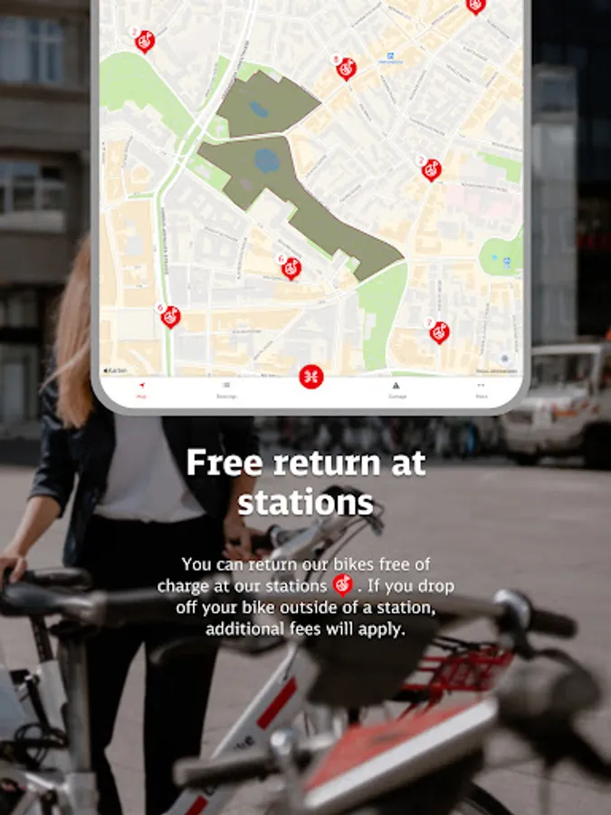 To return the bike, simply drive to a station and press the lock lever down. Do you want to spontaneously park your bike outside our stations? No problem! With only 1 Euro Flex-Fee you are flexible. A service fee applies in the grey areas of the map. You can see the details of your journey and the costs at any time in your bookings. Other options within the app: redeem voucher codes, report damage and manage your customer account.