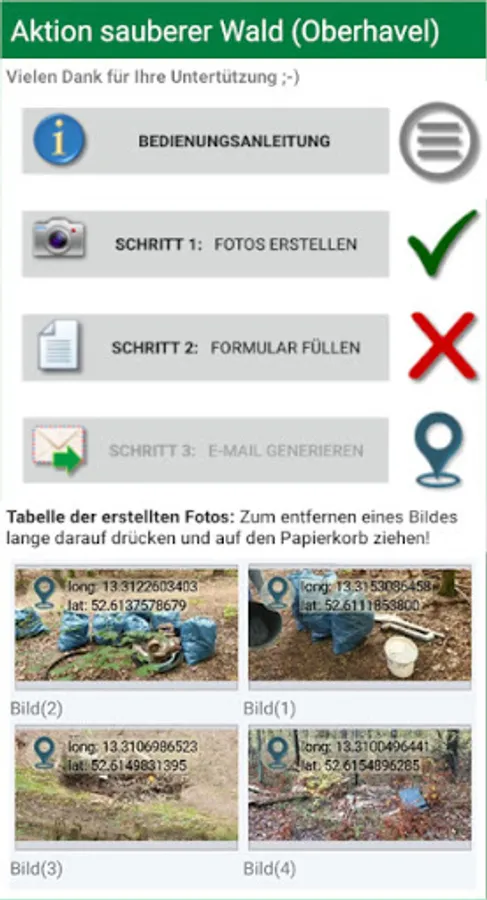 With this app, it is absolutely easy to photograph these garbage sites and report them to the appropriate authority, the Oberhavel district. The GPS coordinates can be recorded automatically, so that only a rough description of the local situation is required.
