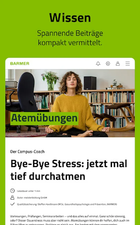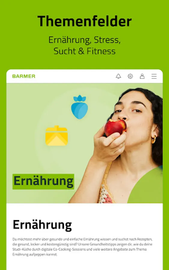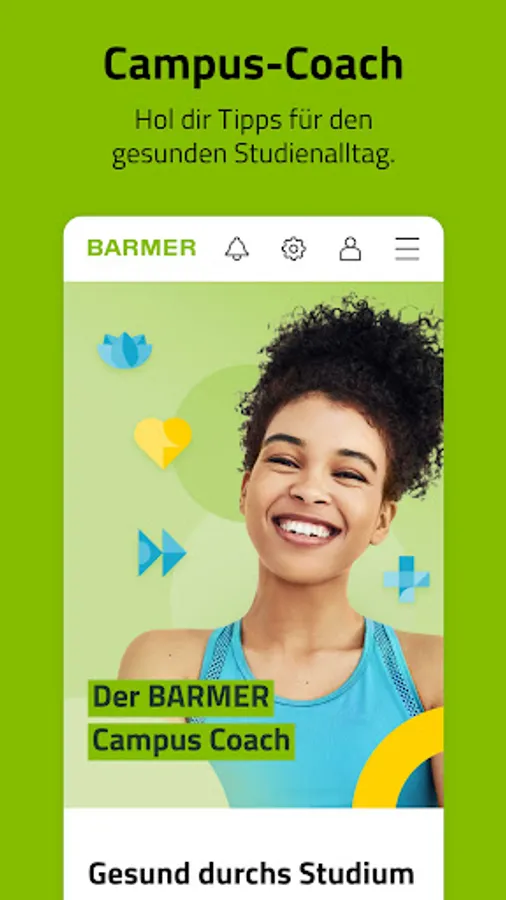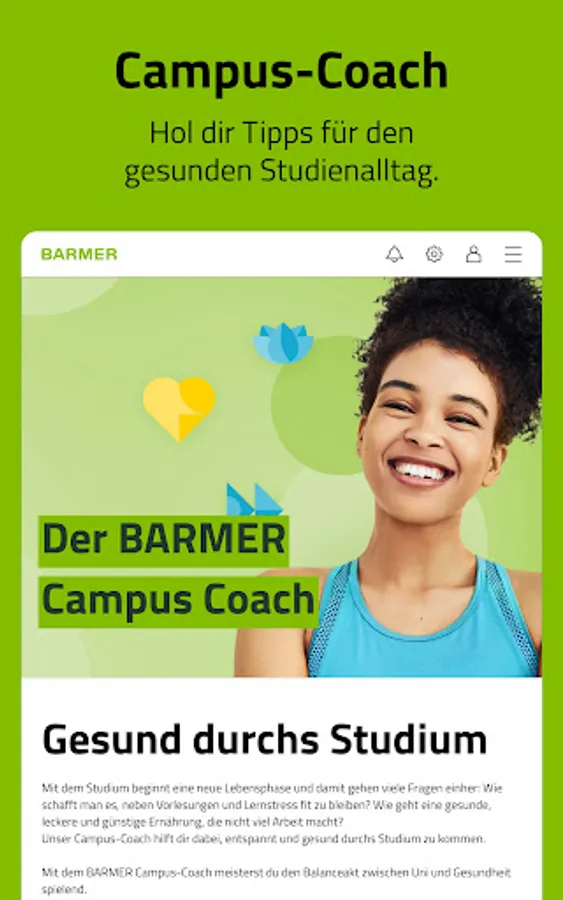 The Campus Coach is a free digital health offer for students that accompanies and supports young people during their studies in the 4 subject areas of nutrition, addiction, stress and fitness.
