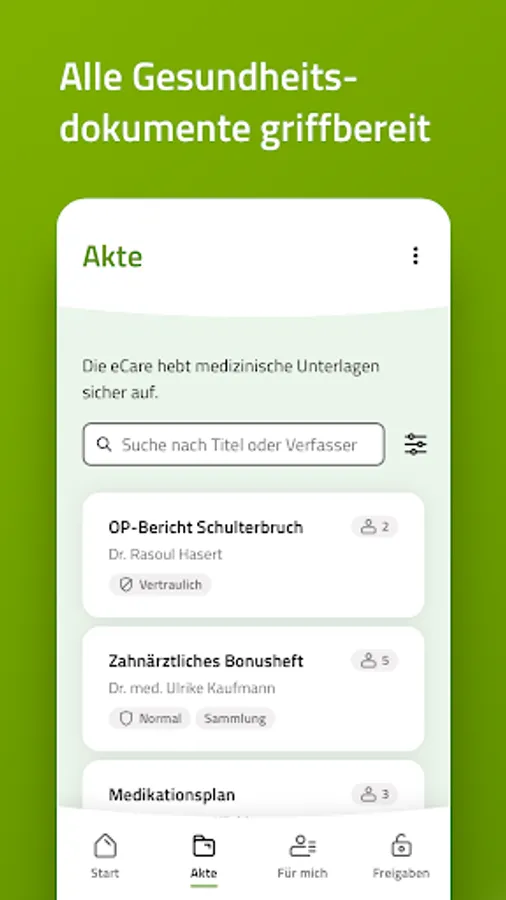 Goodbye folders! With eCare you always have your important documents such as findings, diagnoses, vaccination records or doctor's letters at hand.