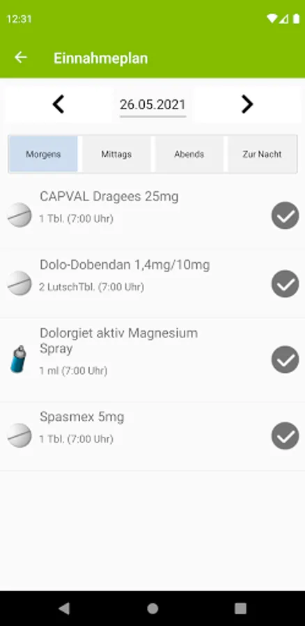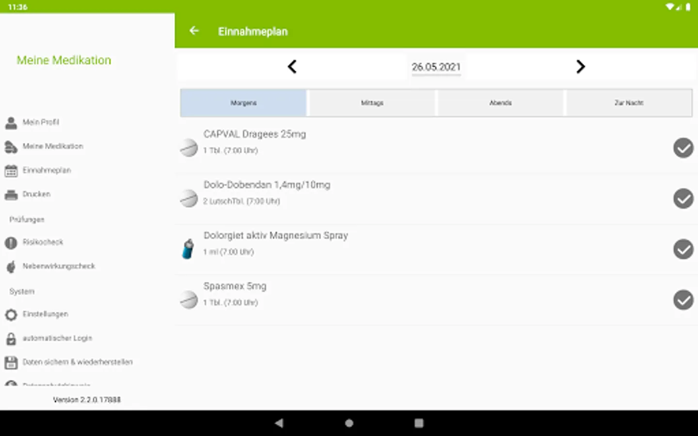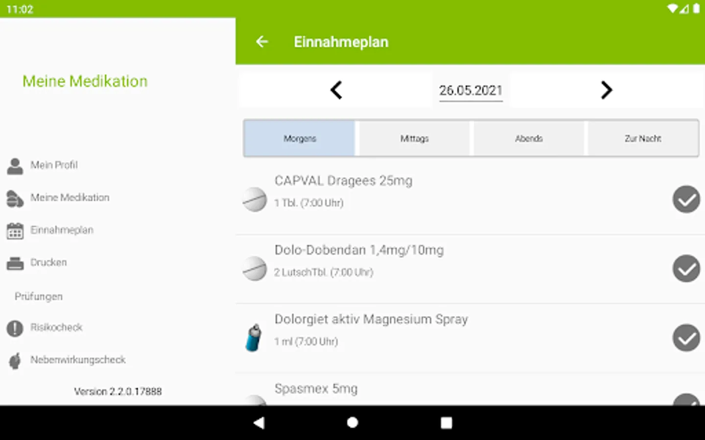 The intake plan offers you an overview of your current medication at the corresponding freely definable intake times.