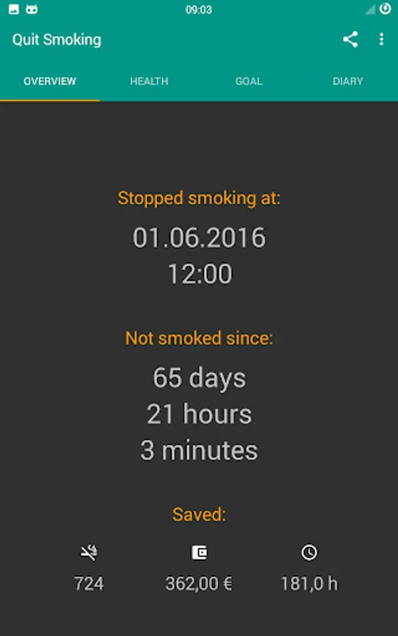 statistics about when stopped smoking, days not smoked and saved cigarettes, money and time.