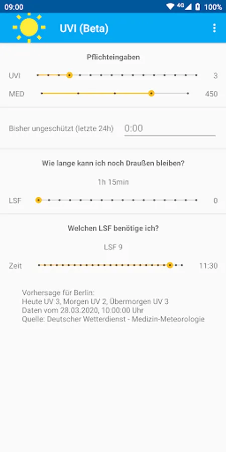 With the help of the MED and the UVI (live updates by the DWD), the maximum unprotected time is calculated before the skin is damaged.