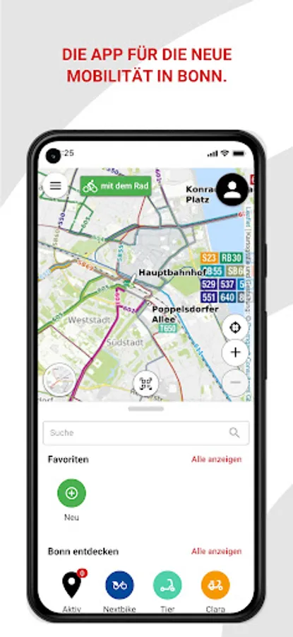 With the update from BONNmobil, it is now possible to individually compile, book and pay for all mobility offers in Bonn online: public transport tickets, nextbike rental bikes, TIER scooters and Clara e-scooters are represented as partners in the app and all offers can combined, booked and paid for. Thanks to single sign-on technology with a single login, which enables the use of all offers. In addition to a complete design overhaul, the interactive character and mobile handling of the app have been further improved, proven applications such as "What's here?" and "Line live" are still on board.