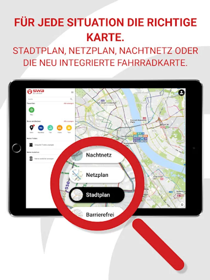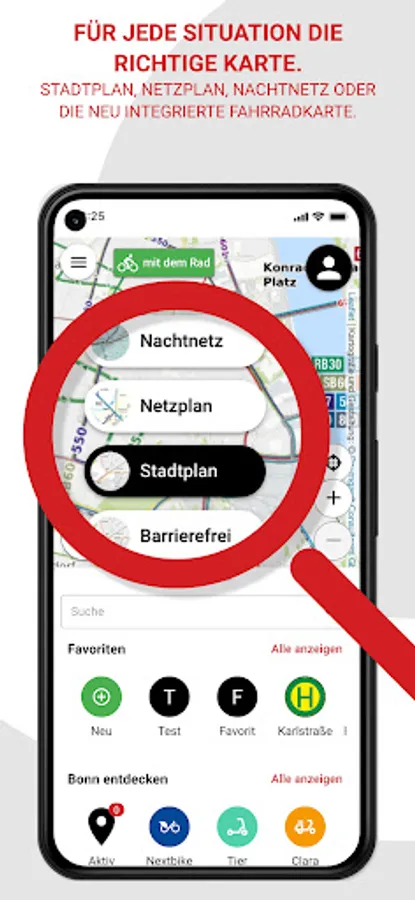 Whether it's a city map, network map, night network or the newly integrated bicycle map - select the map that offers you the best information in the necessary situation. In addition to all cycle paths and fast routes, a separate cycle section “by bike” offers everything you need to know about cycling in Bonn and can be linked to all other mobility data.