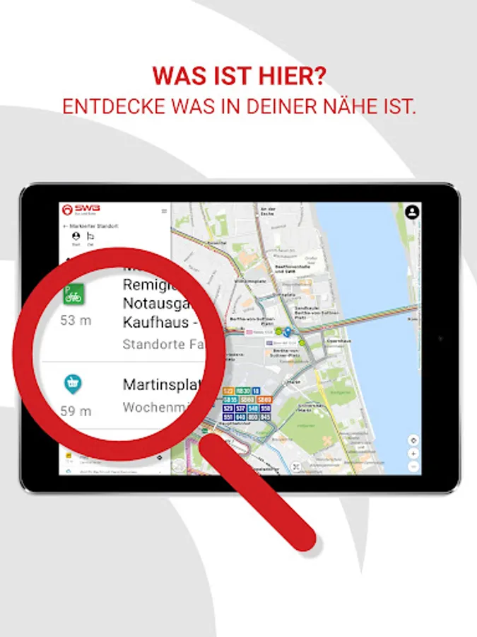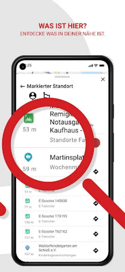 With every click on the map you get information about the location as well as a list of selected points of interest (POI) within a radius of 500 meters, of course also stops, bicycles, scooters and e-scooters. This gives you a quick and easy overview of what is in the area and you can combine this with your planning.