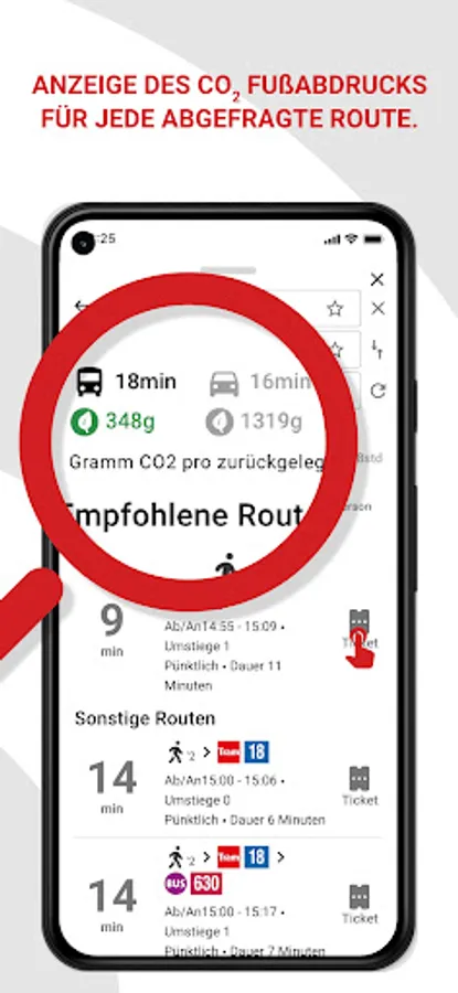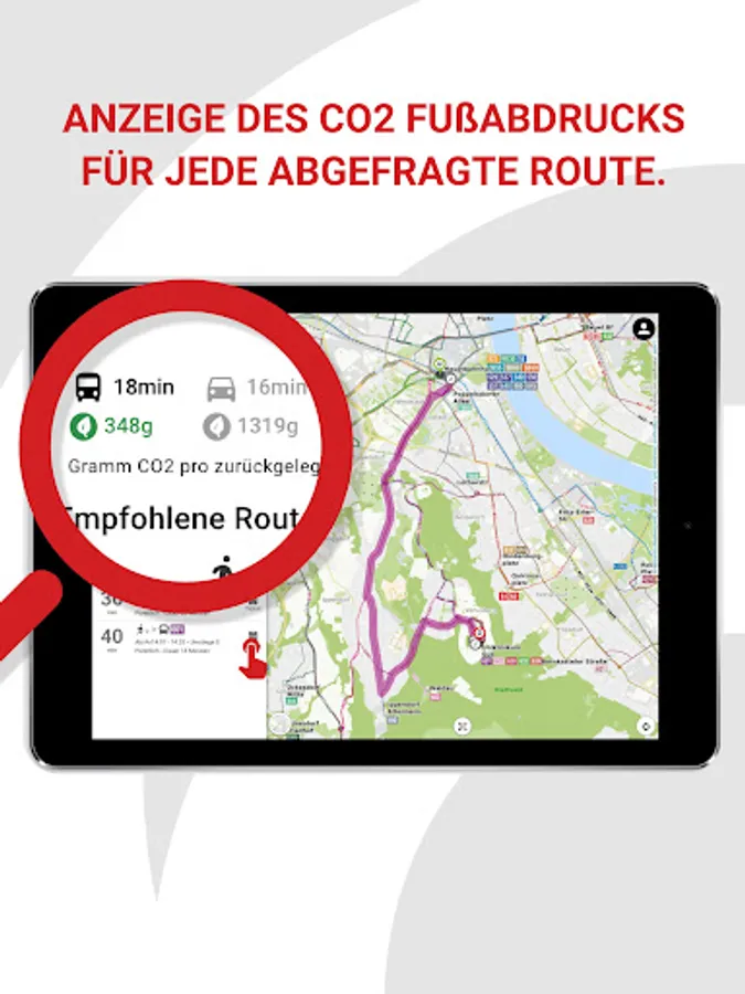 To ensure that you always find the most sustainable route to climate change, the associated CO2 footprint is determined for each route query and automatically displayed for the use of public transport, cycling, walking or driving. After completing the ride with a nextbike or TIER scooter, you will see your personal savings value and can share this with others via social media.
