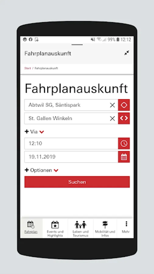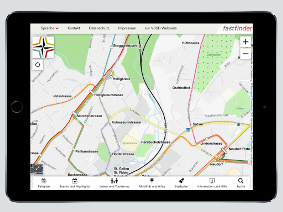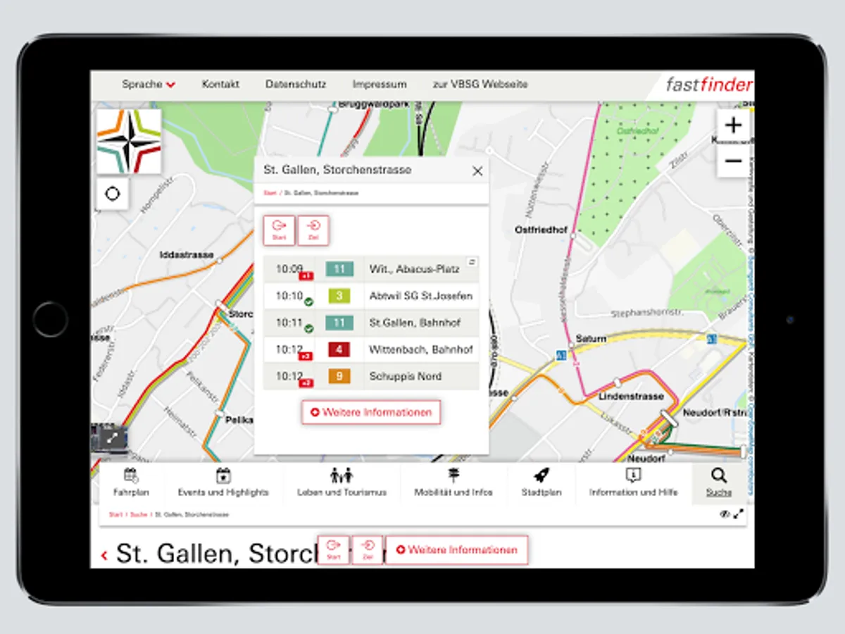 With the fastfinder, the VBSG offers an ideal travel companion. With a few clicks you get timetable information or the next departures in real time. The tool is more than just a roadmap. You will find interesting places from the region St.Gallen Bodensee as well as an event calendar; Of course, always with the appropriate public transport connection.