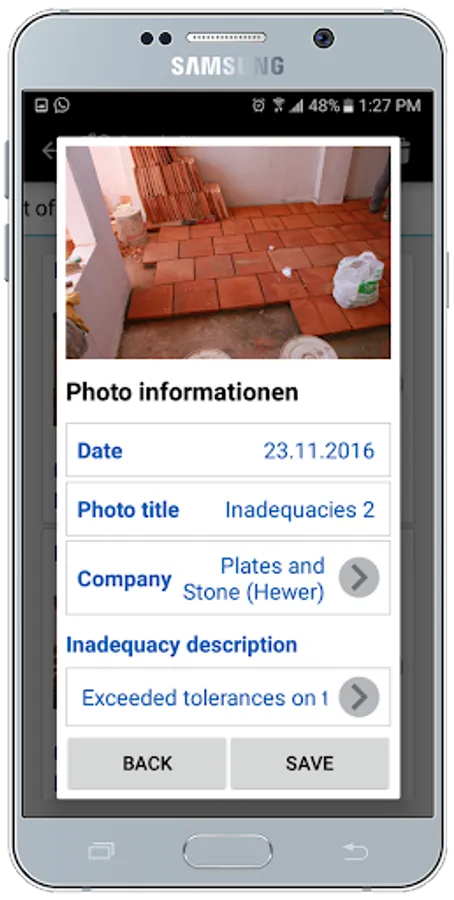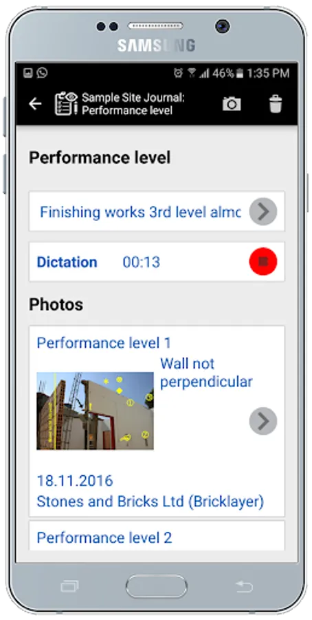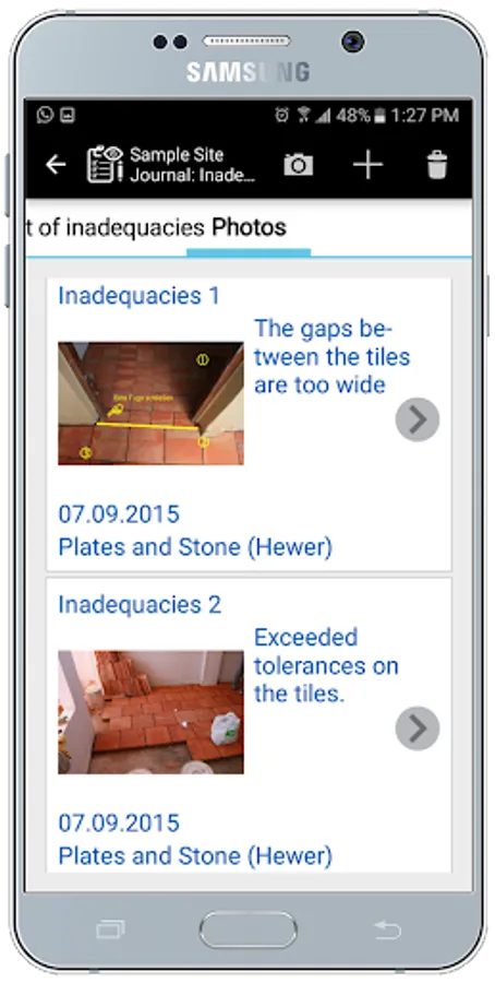 Photos: Photos are added from the device's library or taken directly from the report and stamped with the date of the photo's Exif data. They can be edited (write and draw in photos) after synchronization and uploaded to the web as an HTML photo album.
