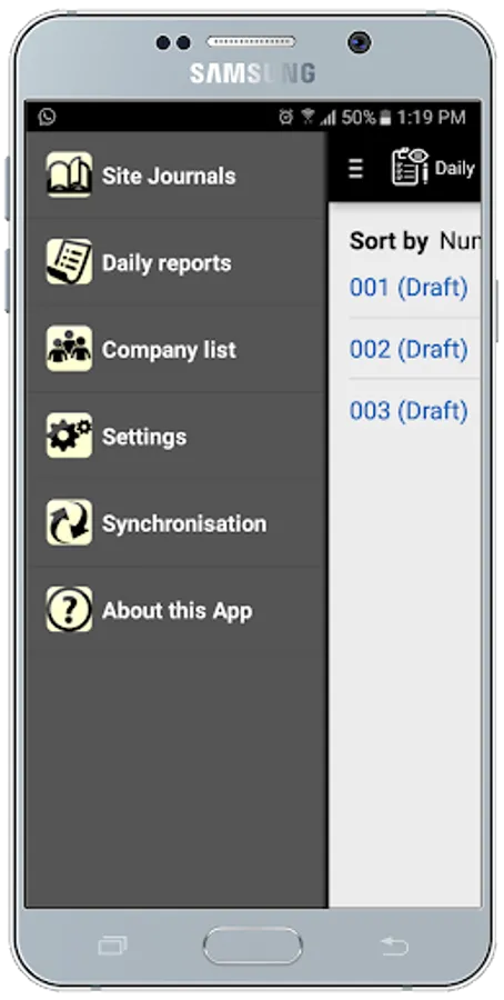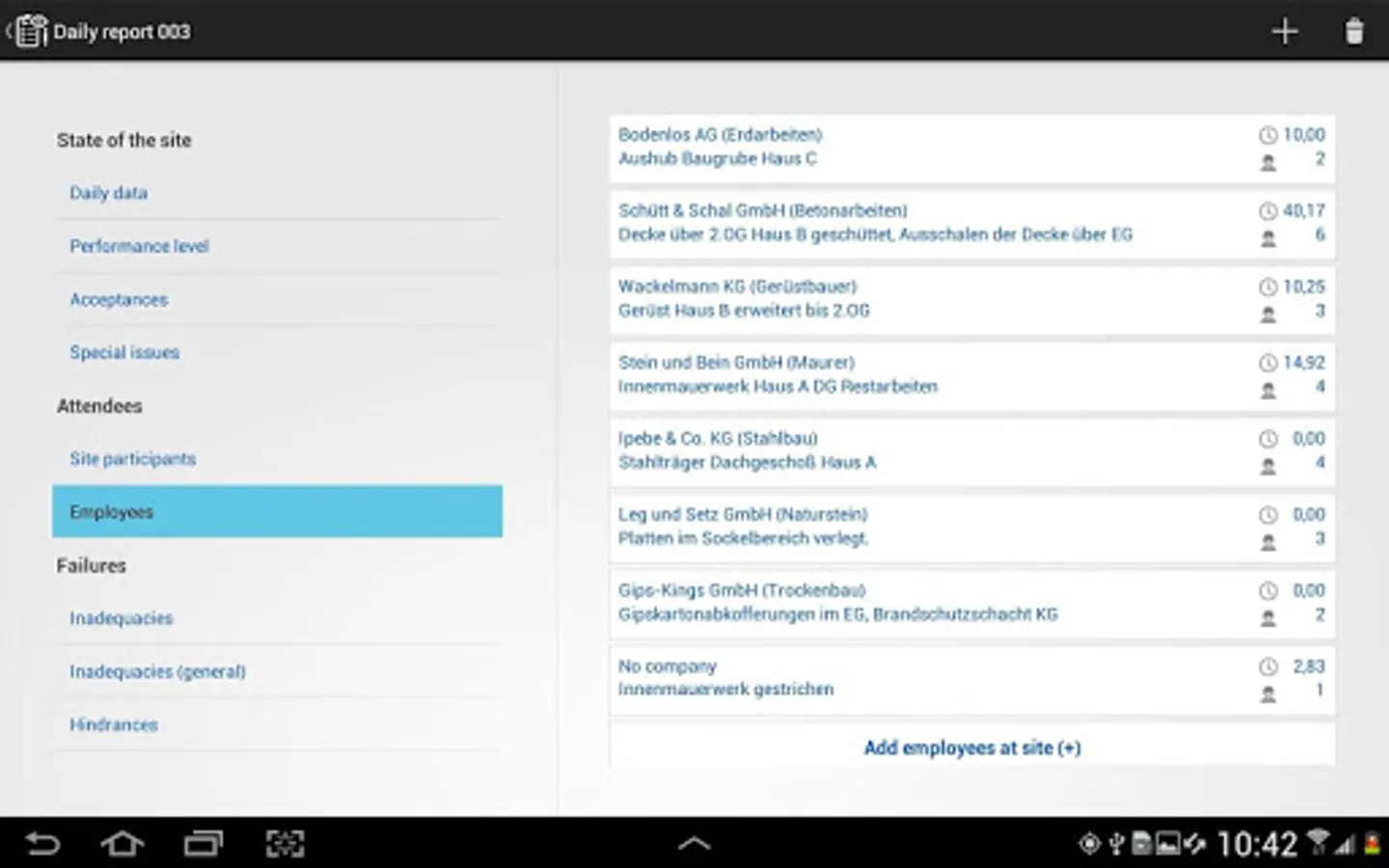 Offline operation: no internet connection is required for the app, it is not a web app. Data connections are not available on many construction sites, so the offline operation of construction diary software is an important criterion. Only synchronization requires a connection. With Android devices, the project can also be transferred via memory card, USB cable or email.