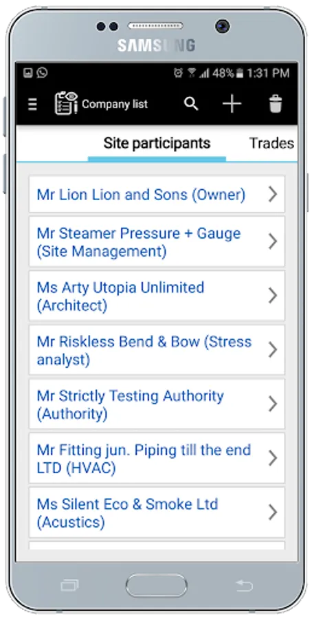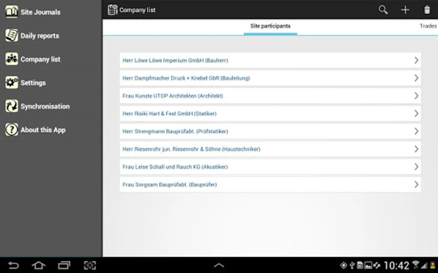 Contacts import: the contacts from the smartphone or tablet can be completely imported into the company lists of the project. Companies can also be added at any point in the app without directly opening and editing the company lists.