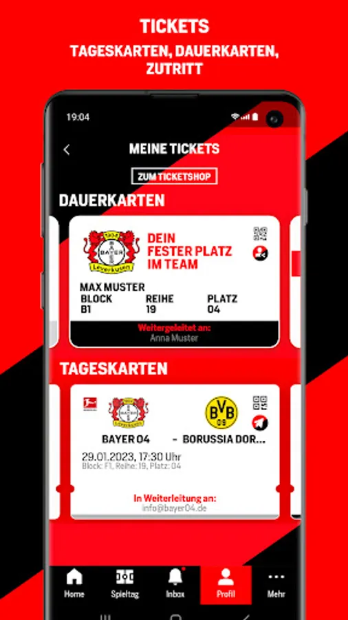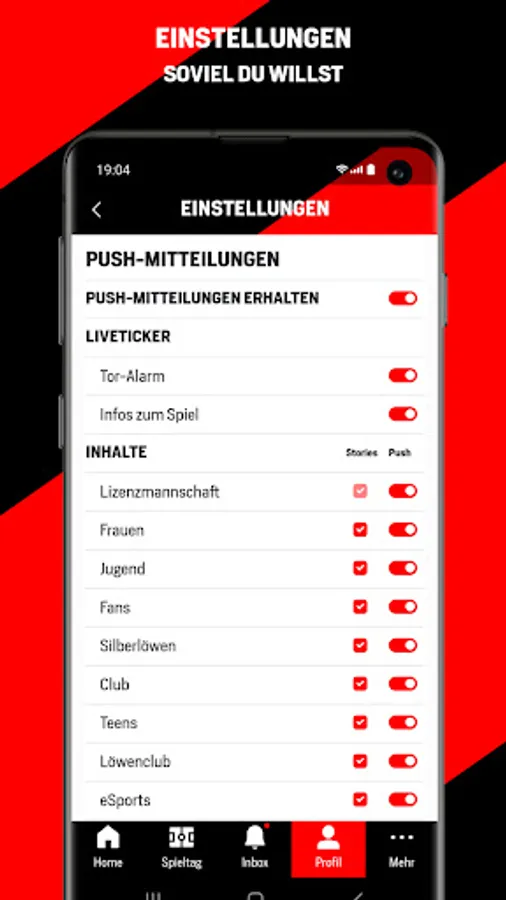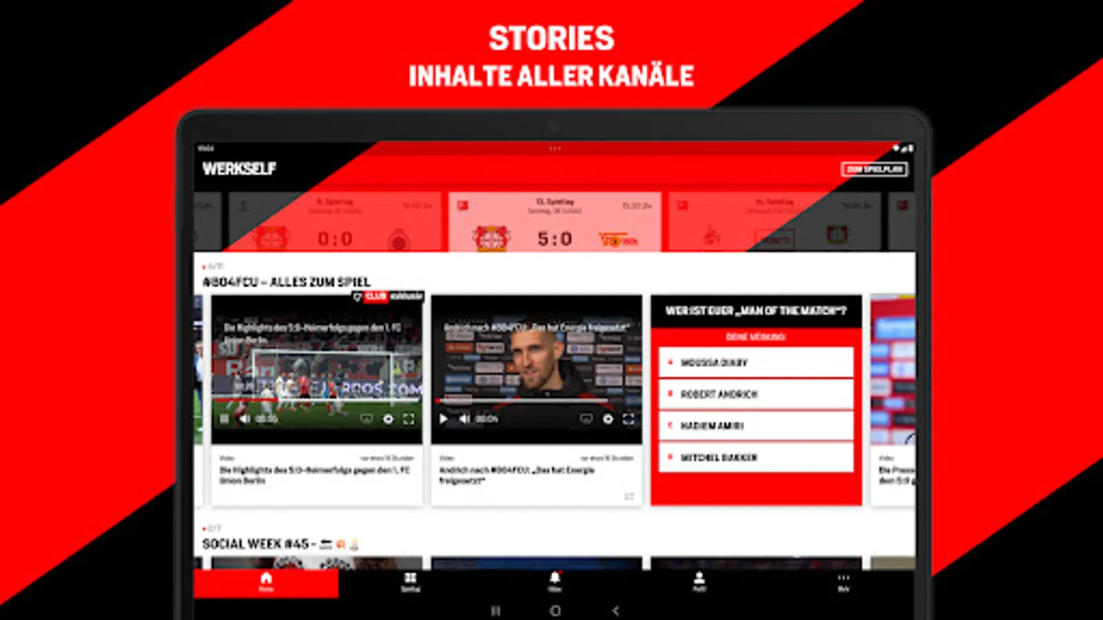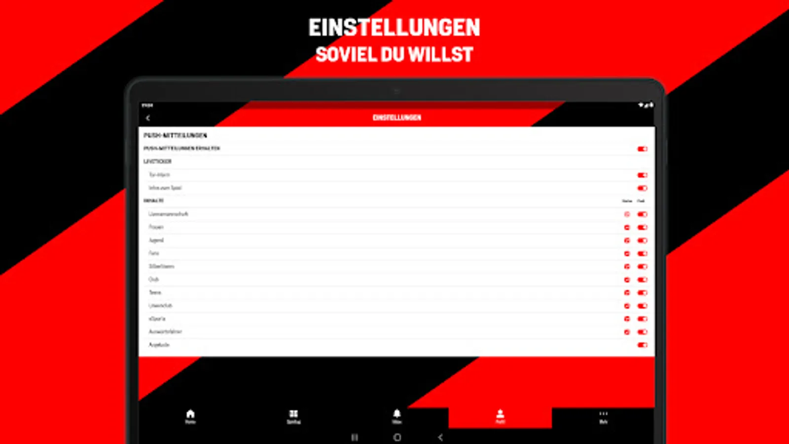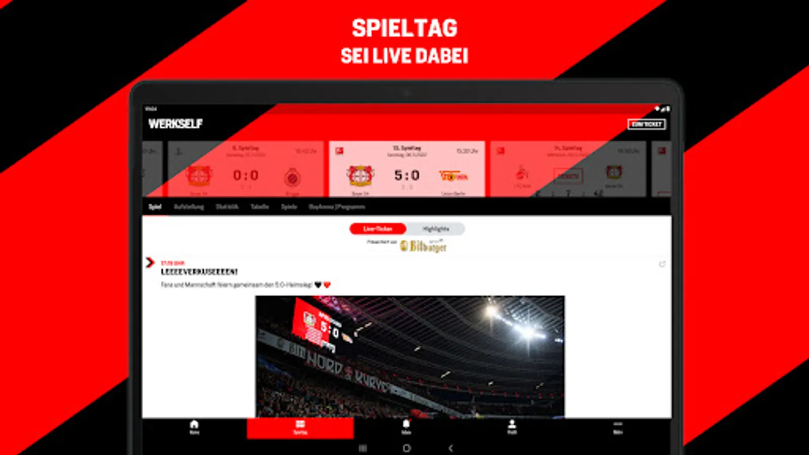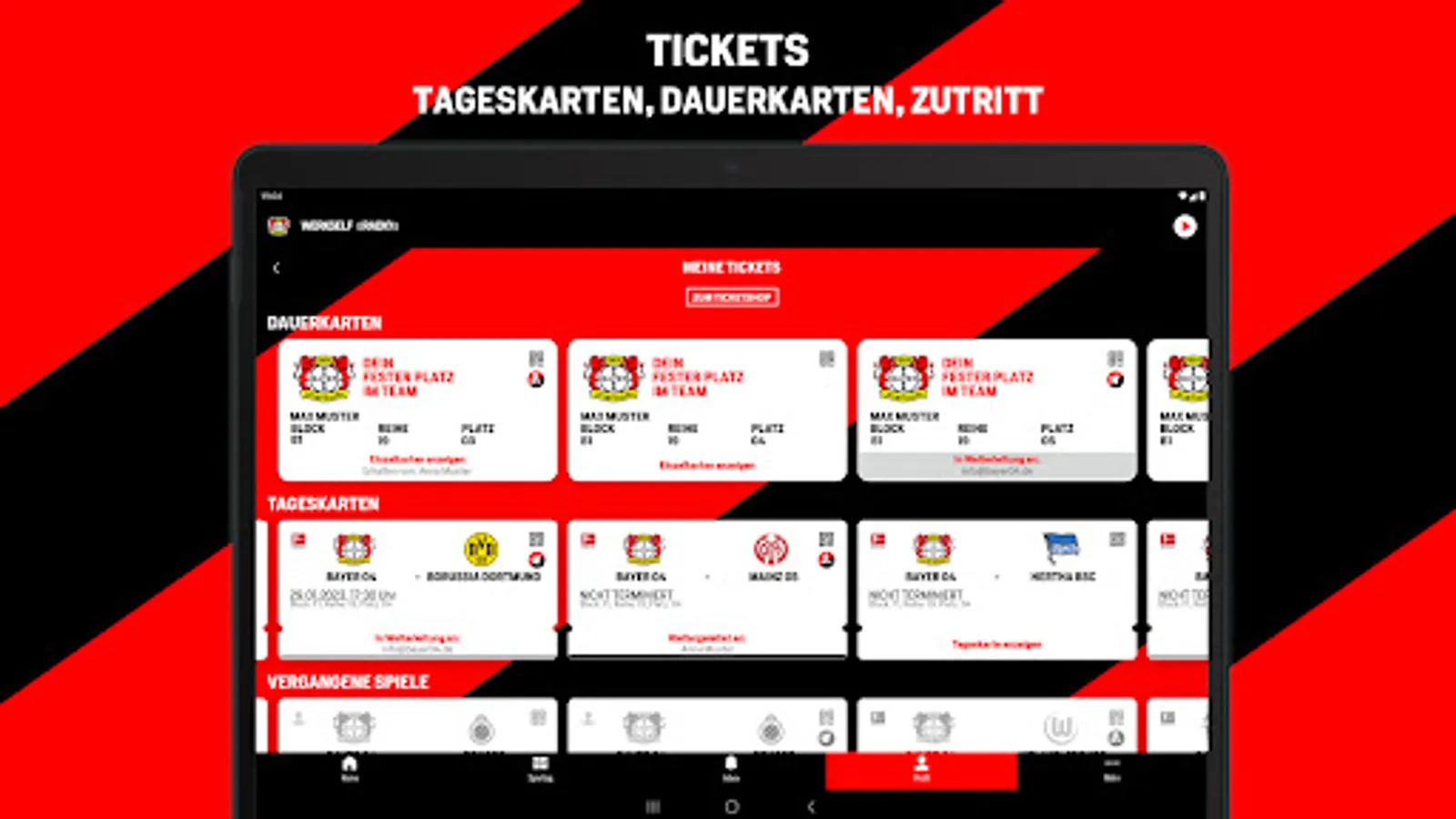 You have the opportunity to put together the black and red content according to your preferences and interests. Stories and push messages from various subject areas such as the Werkself, women, young talent, fans, offers and many more can be selected or deselected. So you only see the content that interests you. The customization and personalization of the content with the login function, the ticket display, the digital membership card and much more make the new app a constant companion. The complete Bayer 04 package – everything can be accessed anytime, anywhere.