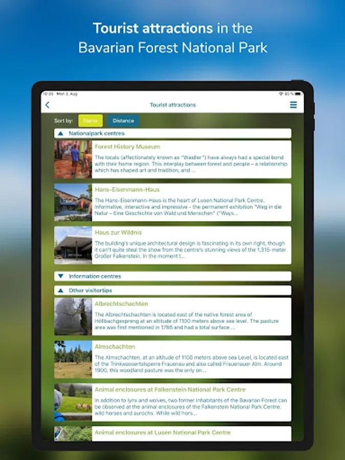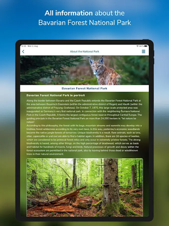 With this app, Germanys oldest national park can be experienced even deeper: 26 selected excursion destinations, 40 tour tips, from adventure to hiking, cycling or snowshoeing rounds to barrier-free tours. In addition there is lots of exciting information about wild nature, and a webcam that offers a current picture of the national park.