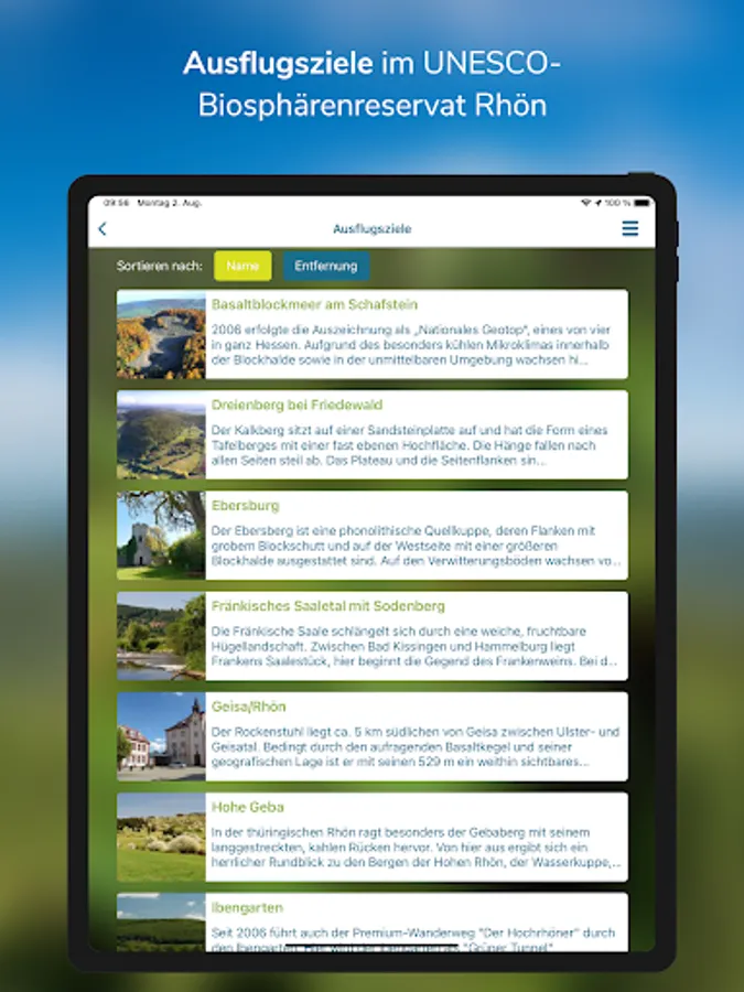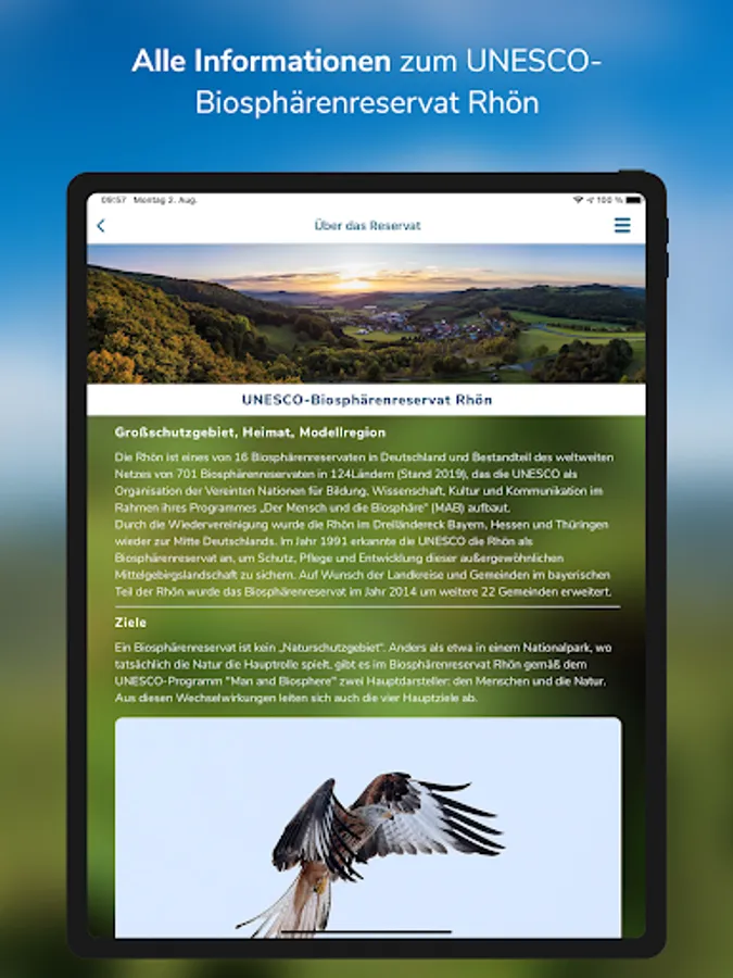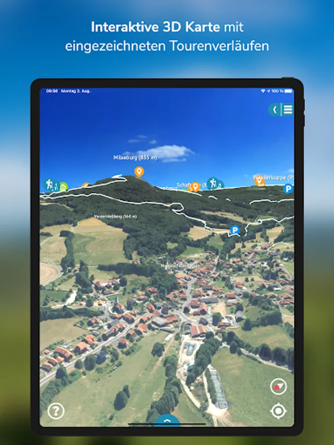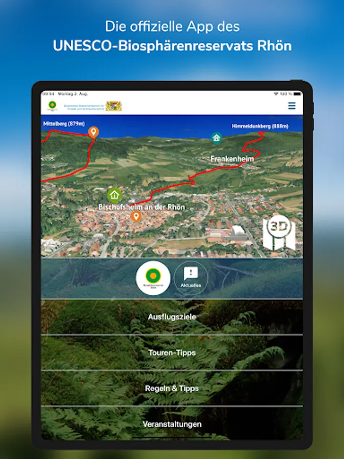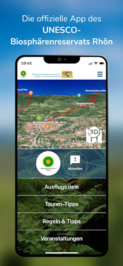 Hiking and cycling, finding out about species and nature conservation and enjoying regional products: the UNESCO Rhön Biosphere Reserve is full of treasures to be discovered. The new 3D app is the ideal personal assistant for this. The unique landscape with its diverse bike and hiking trails is shown as it really is. All important geographic information is incorporated into the map. With an exact location function, your own position can be checked at any time. A change between 3D map, topographic map and aerial photo is possible at any time.