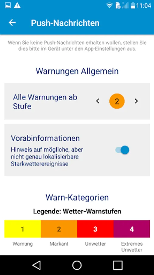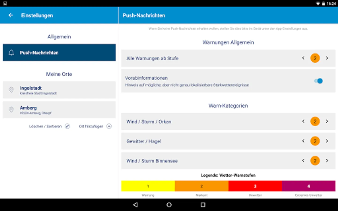 The user can specify up to five locations, e.g. As residential, work and resorts, for which he selects his important for him hazard warnings or environmental information. In weather and weather warnings, he can set the warning level individually. In addition, he can always use GPS to find out about his current and location-independent environmental situation.