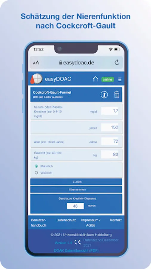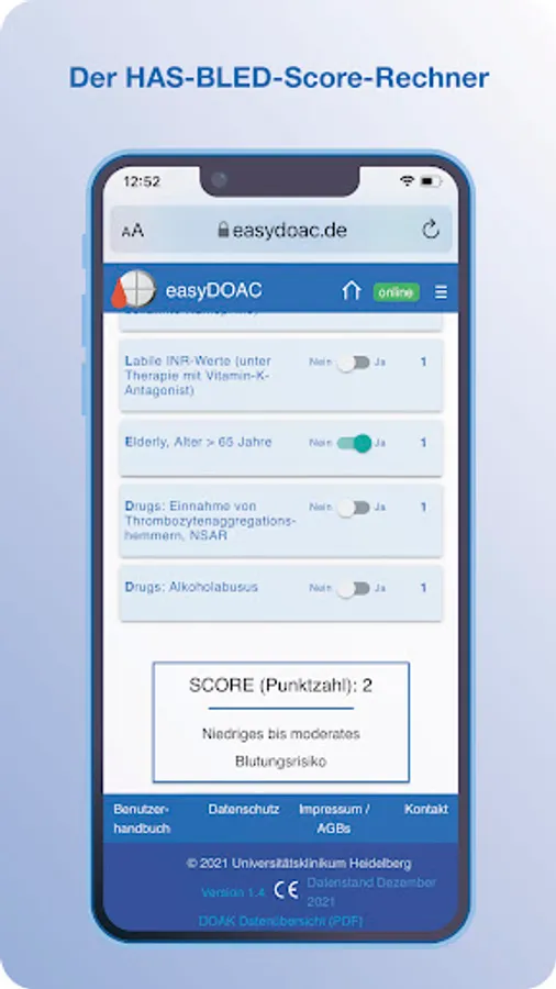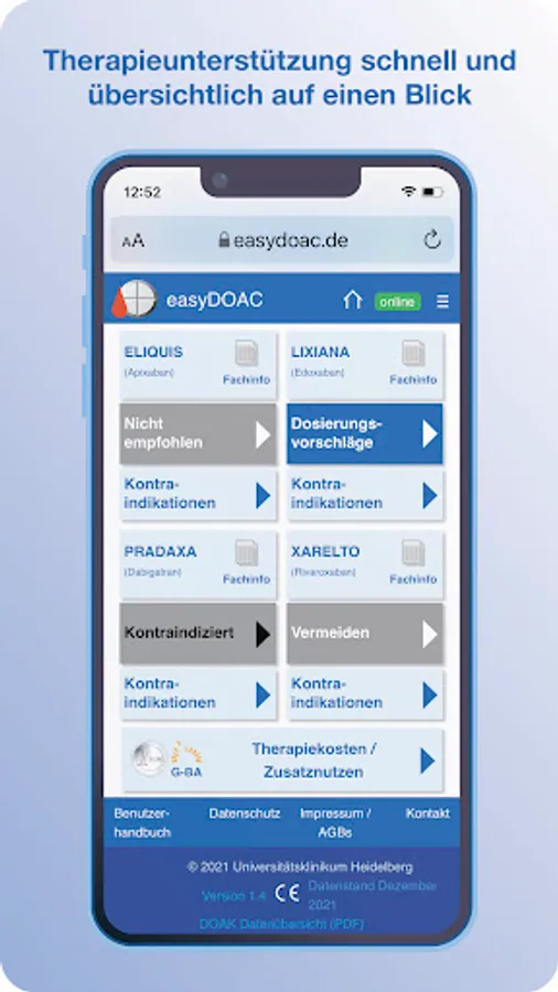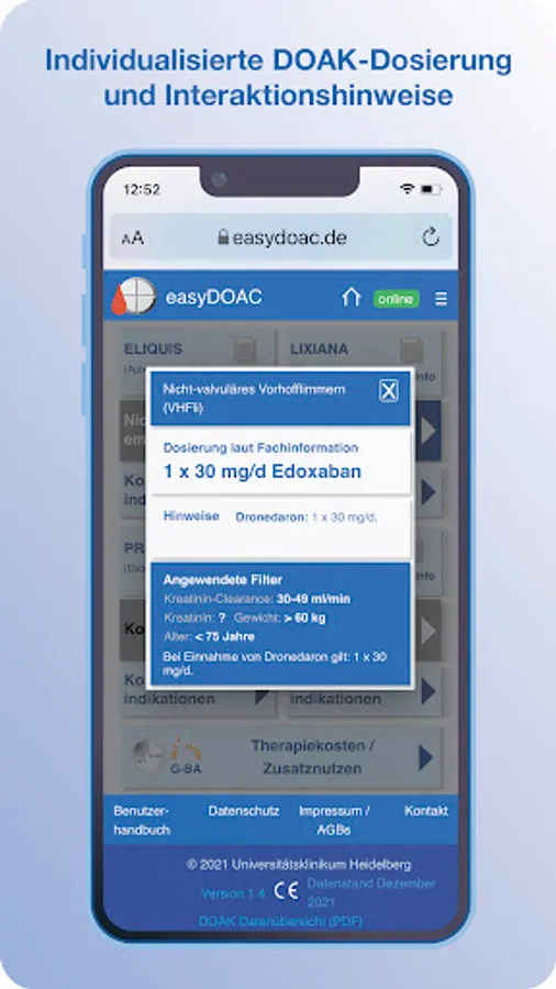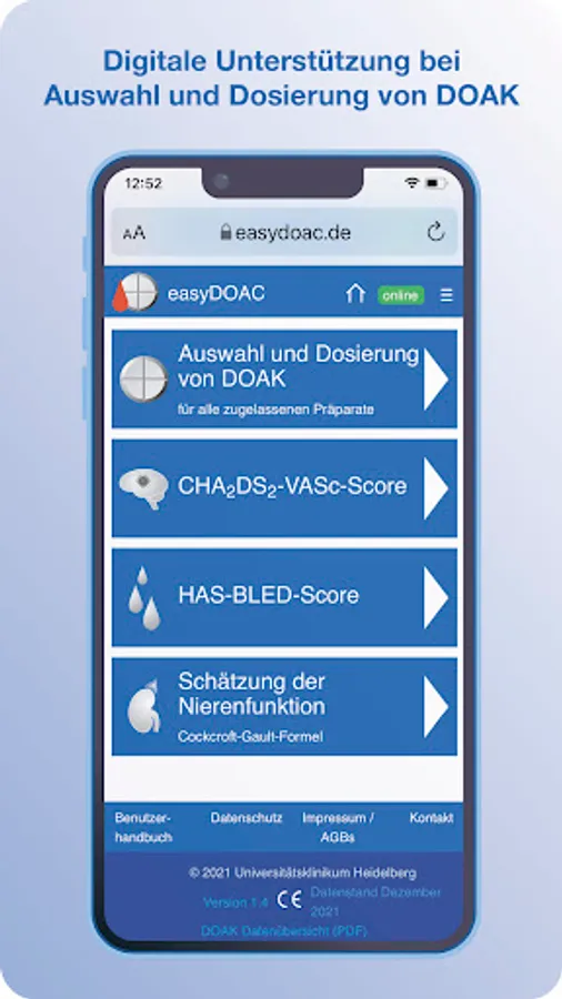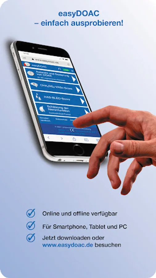 easyDOAC provides information on all approved direct oral anticoagulants (DOAC), their approved indications in adults and dosages, taking into account age, weight, kidney function, indication and concomitant medication, based on the officially approved current instructions for use for healthcare professionals (information for professionals) and selected peer-reviewed sources. In addition, the app enables an assessment of stroke risks (CHA2DS2-VASc score) in patients with atrial fibrillation (AFli), bleeding risks under oral anticoagulation (HAS-BLED score) and the estimation of individual kidney function with the formula recommended for this (Cockcroft-Gault Formula).