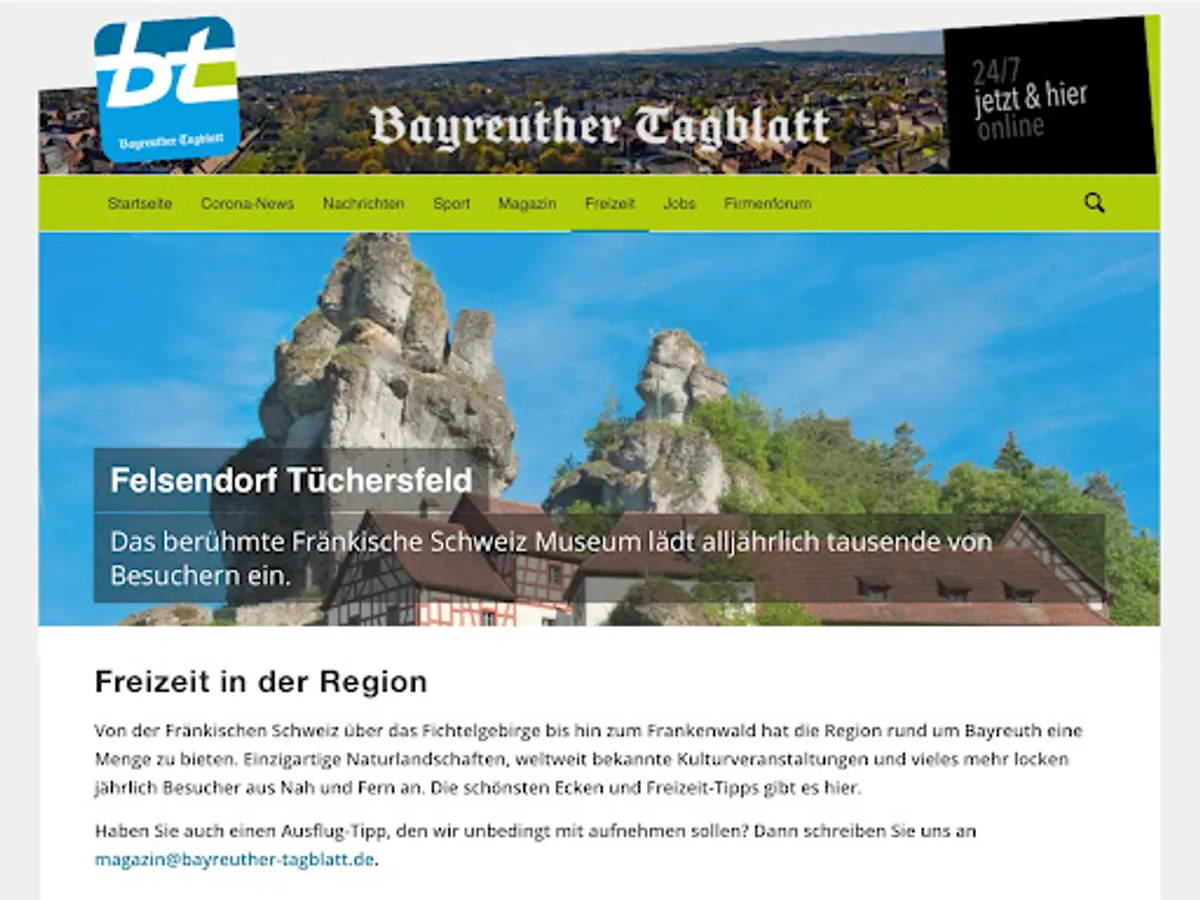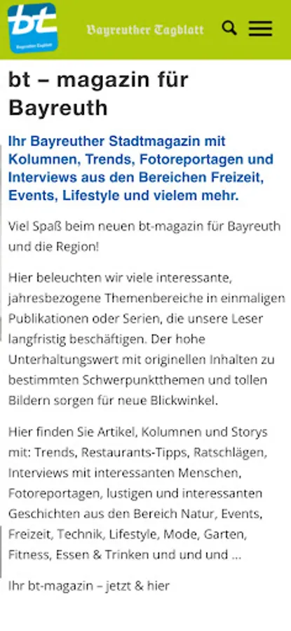 Be informed around the clock - it's easy with us! Local issues in and around Bayreuth and beyond. It has never been easier. Install and start the app and scroll through the latest news and advice topics. Find your dream job in our job exchange or start an apprenticeship with our TOP employers in the region. In the magazine you will find valuable advice linked to the appropriate contact points. You will also find exciting topics such as lost places, but also the best restaurants in our online magazine. Curious? Then download the app directly!