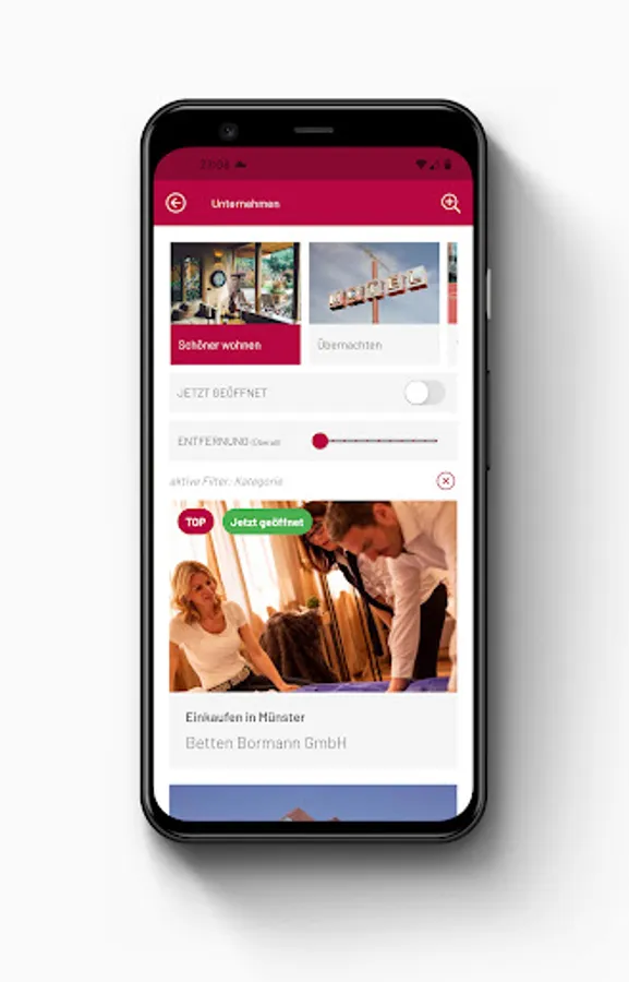 In the app you will find exclusive offers from our partner companies. These are companies, businesses, shops, restaurants, service providers, the self-employed, but above all regional and local partners who offer you special services and benefits in Münster. With the filter function in the app, you can display companies nearby and find out which shops are now open.