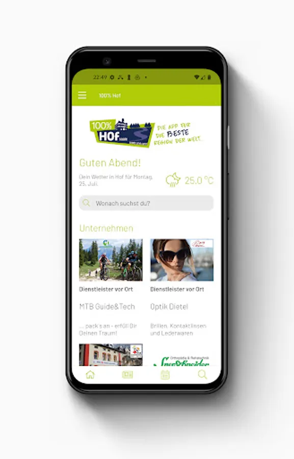 With the 100% Hof app you get exactly the information and tips you need - at any time of the day: in the morning all the latest news from Hof, at lunchtime suitable restaurant locations for your lunch break and at the end of the day there are concerts, cinema visits or exciting ones Tips for going out in the Hof region.