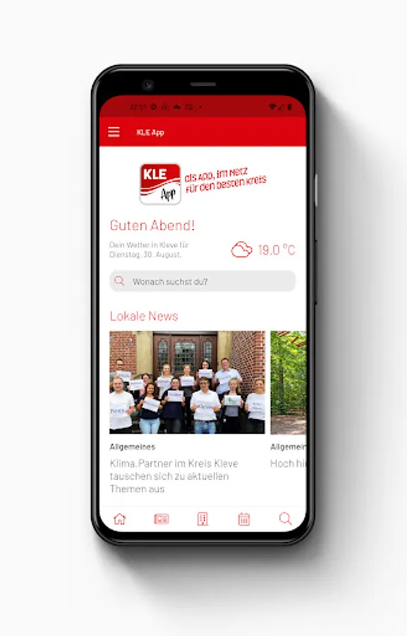 With the KLE app you get exactly the information and tips you need - at any time of the day: in the morning all the latest news from the district of Kleve, at lunchtime suitable restaurant locations for your lunch break and at the end of the day there are concerts, visits to the cinema or exciting ones Tips for going out in the Kleve region.