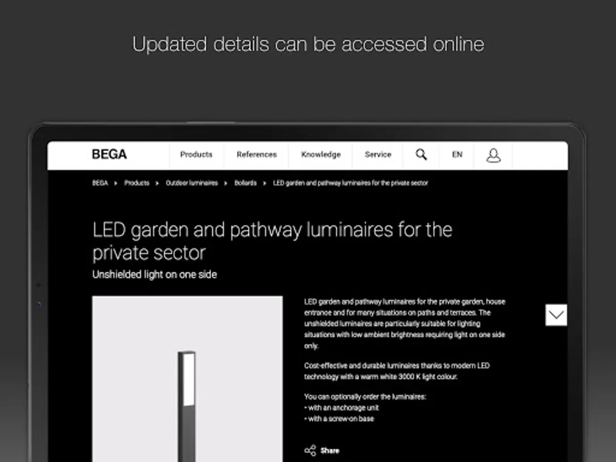 · Evaluate BEGA luminaires in real time and in the area you plan to install them