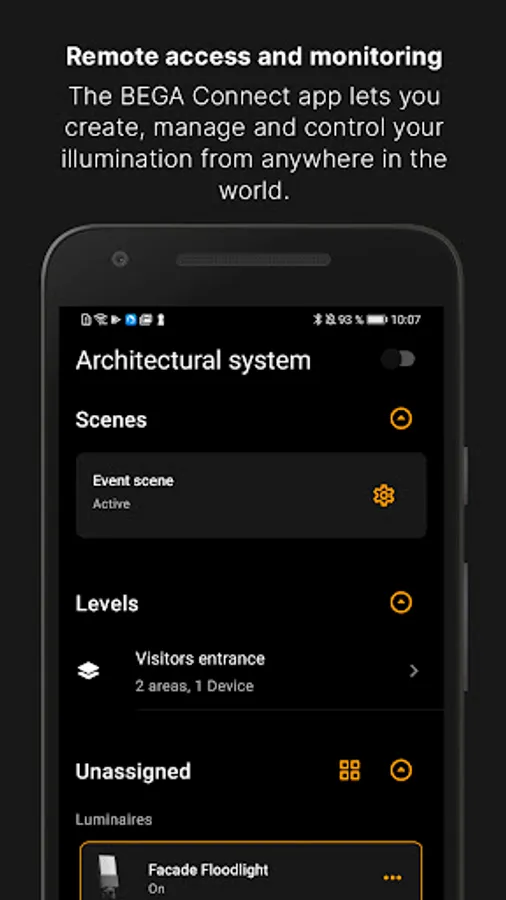 BEGA Connect allows you to make every architecture project stand out with smart light. Wherever you are: you can now plan and monitor individual luminaires or even entire systems from any location using our modern and intuitive app. All you need is an internet connection.