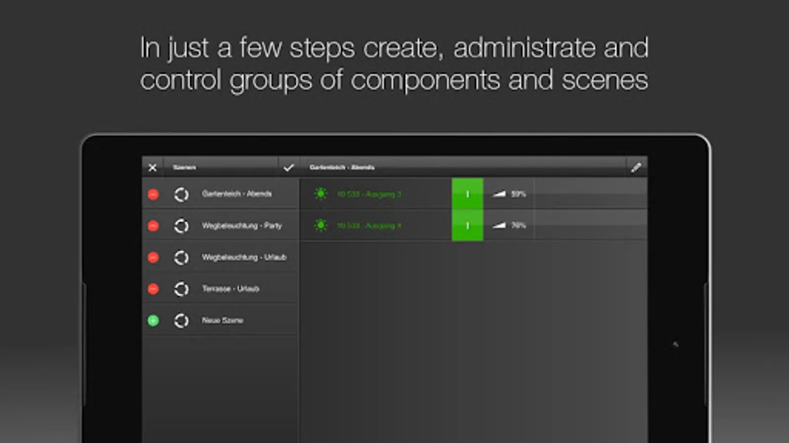 Devices can also be grouped together and incorporated into scenarios of your choosing. With the push of a button you will experience the perfect feelgood atmosphere or the ideal working environment.