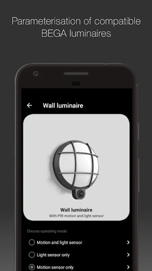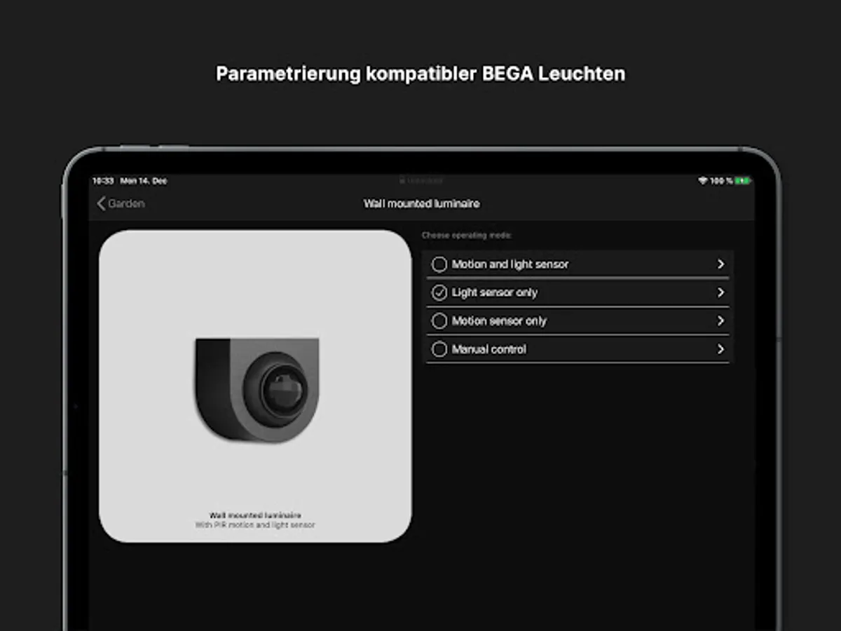 With BEGA Tool, the complex parameterisation of compatible BEGA garden and pathway luminaires with integrated motion and light sensors is achieved in just a few steps.