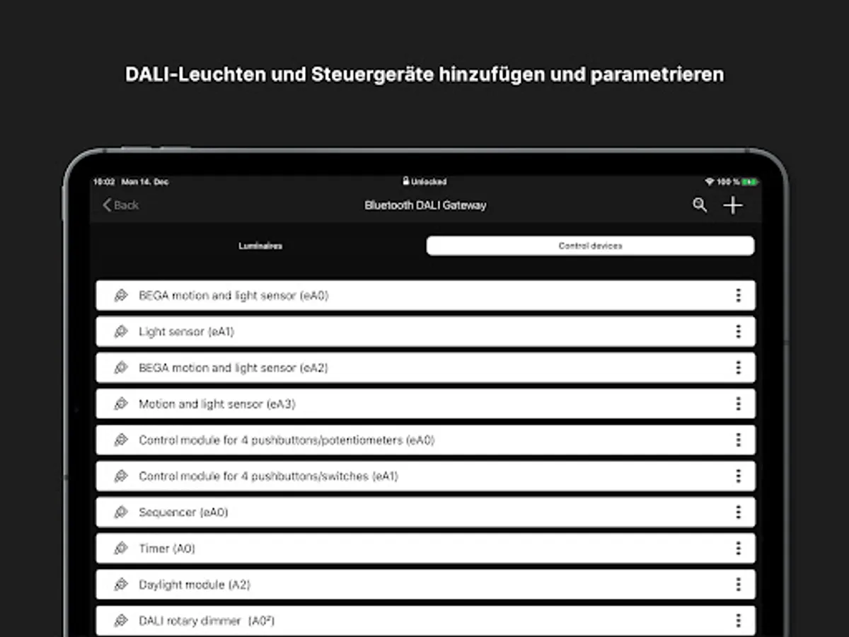 For the BEGA Bluetooth DALI Gateway 71075, BEGA Tool is the central tool for configuring and parameterising the components in your DALI setup.