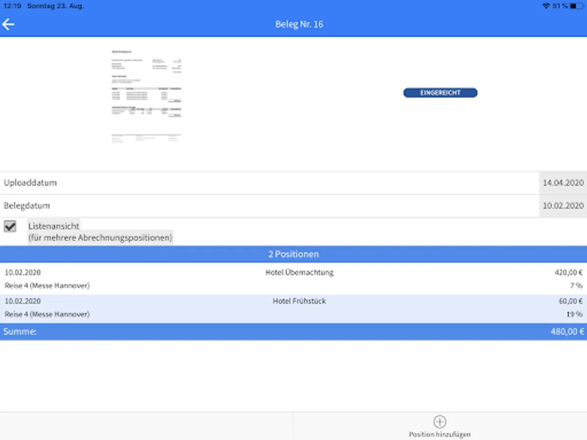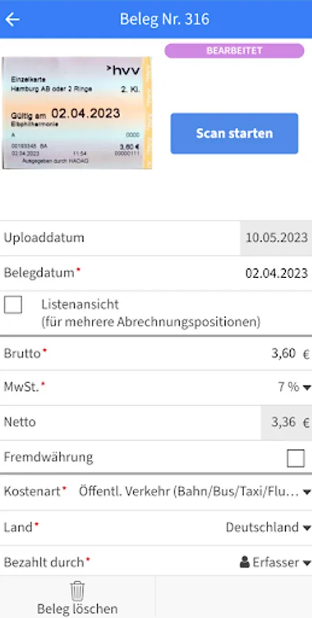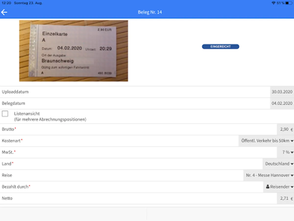 Settle travel expenses quickly and easily: a photo is enough. Belegmeister reads the date, amount and VAT. No stress, no annoying typing! For solo self-employed and companies.