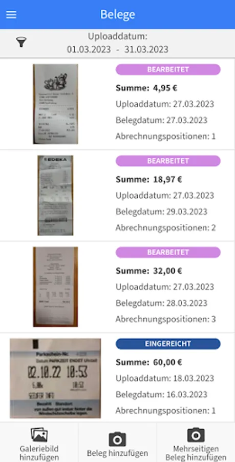 Take photos of your receipts conveniently on the go using your smartphone or tablet. Simply export the completed statement in PDF, CSV or DATEV format using the mobile phone app or on your computer at home using the web application.