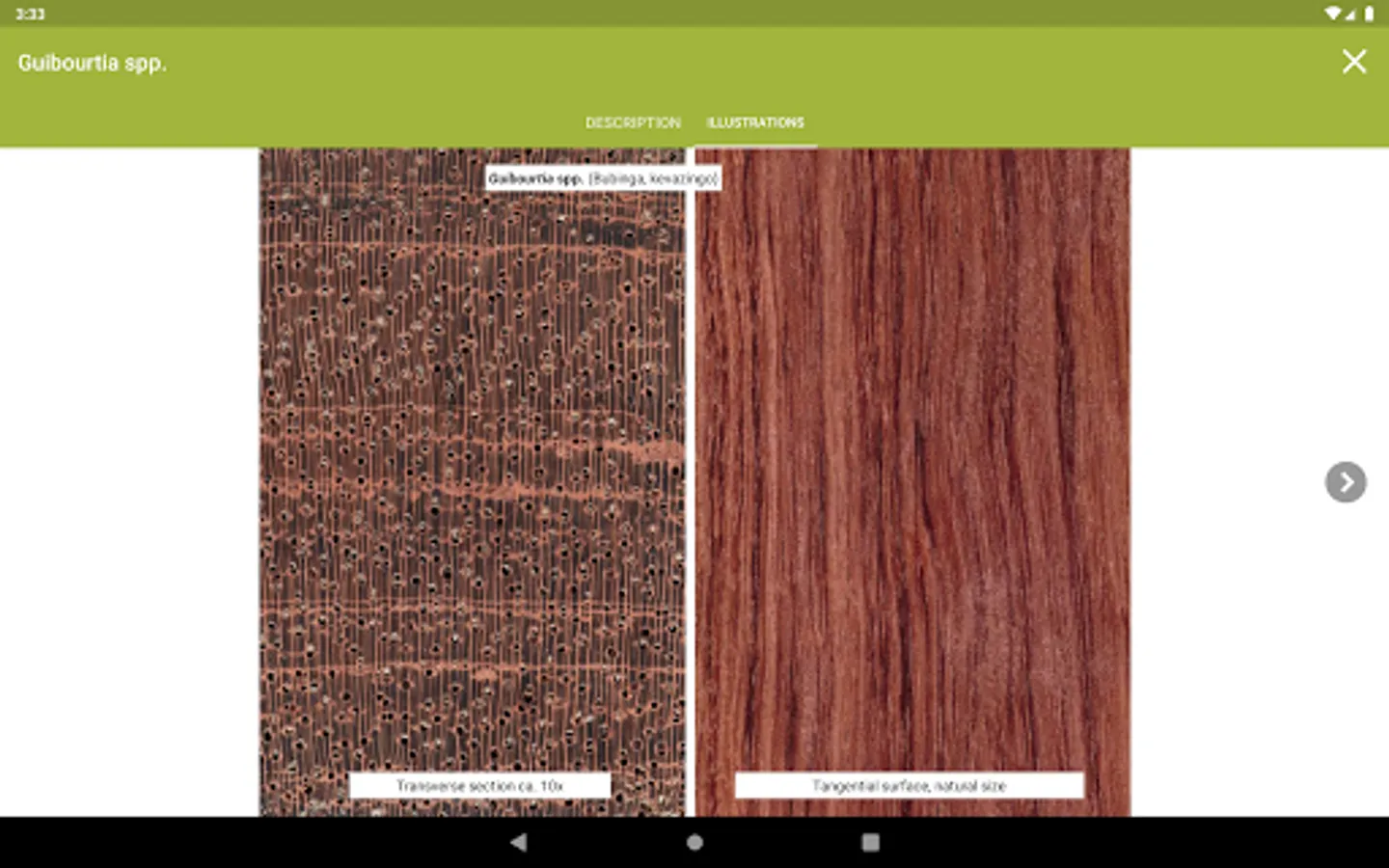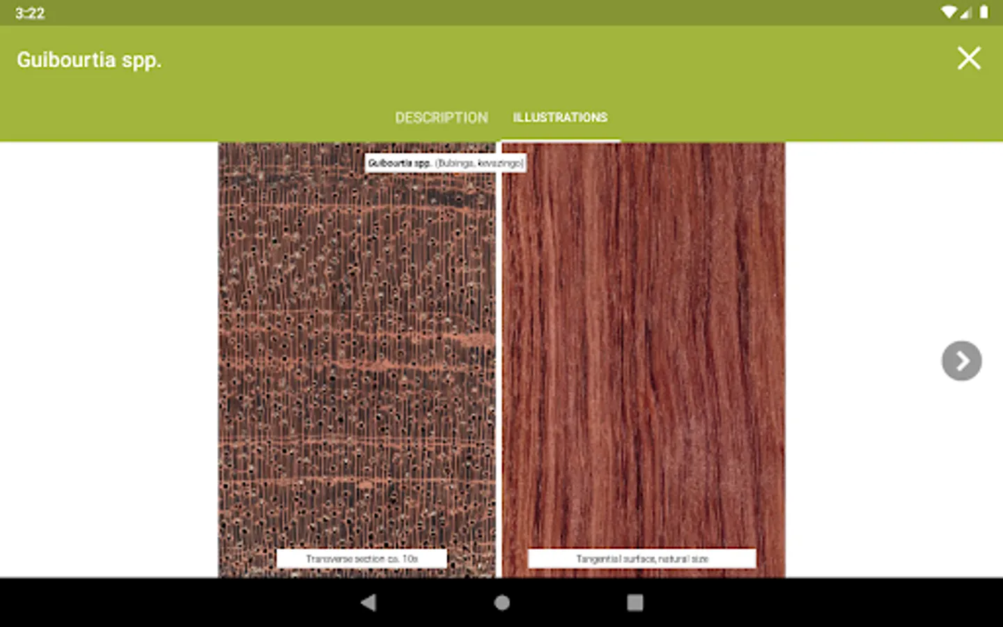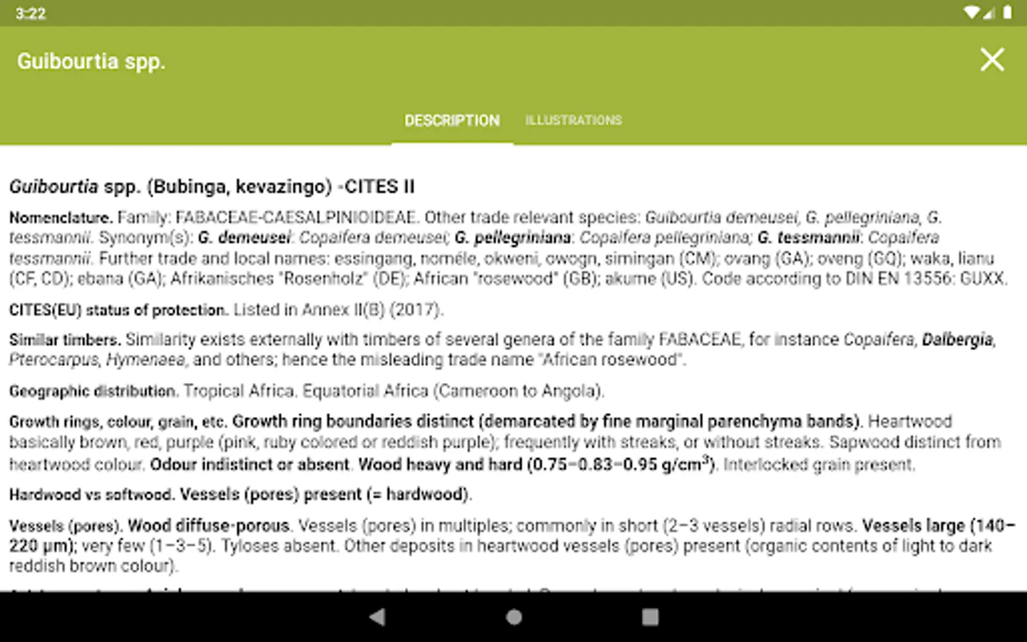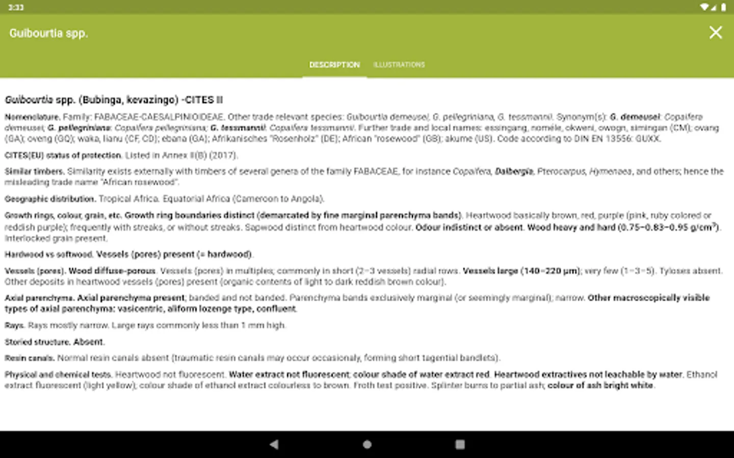• interactive identification of the most important CITES-protected timbers (hardwoods and softwoods) based on macroscopic features to be observed with the unaided eye or with a hand lens