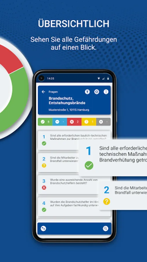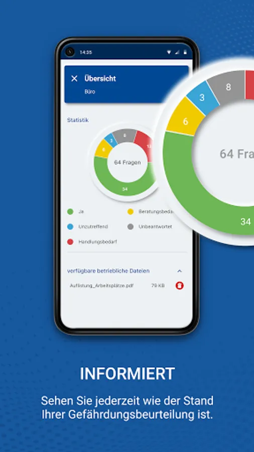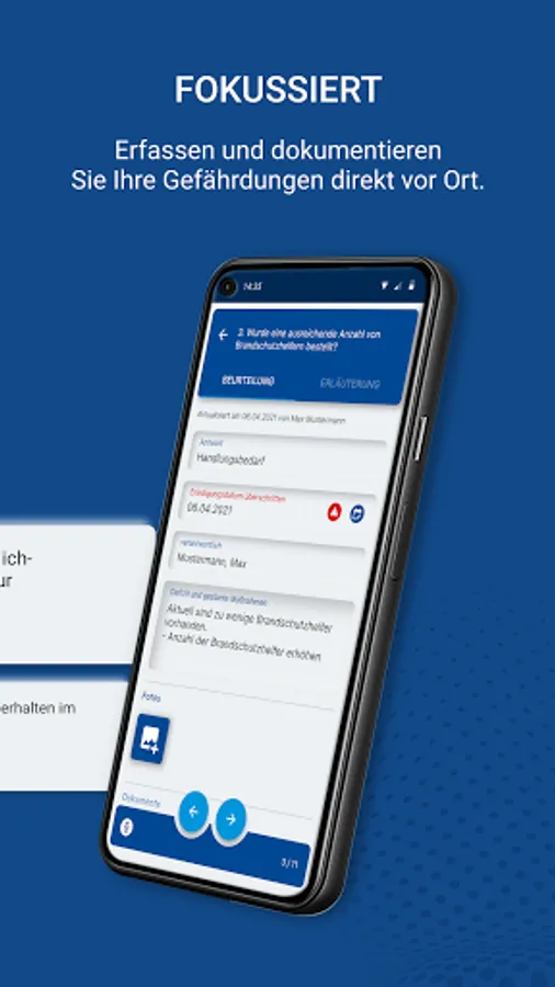Every question can be answered on the smartphone in the same way as on the PC. In addition, photos taken in connection with the risk assessment can be attached to the questions. Everything is automatically synchronized with the GBO.