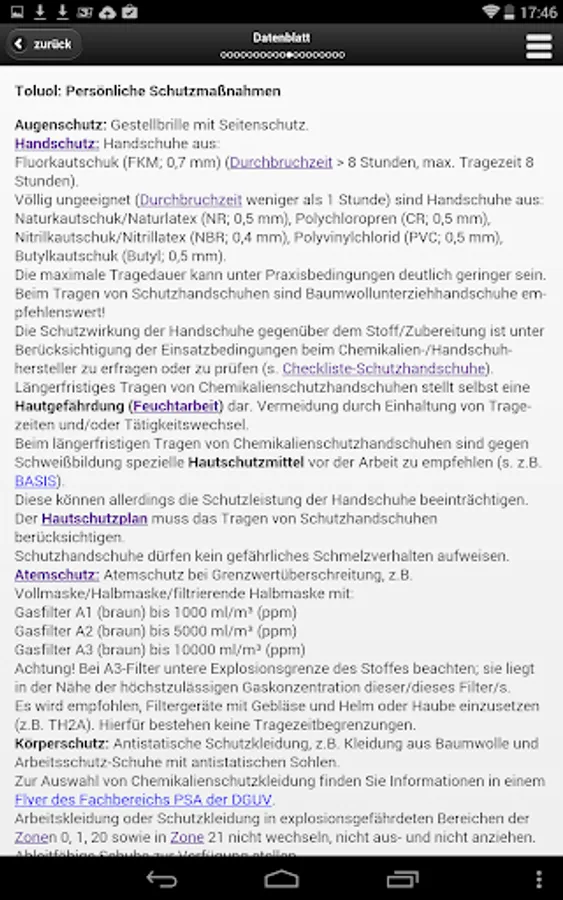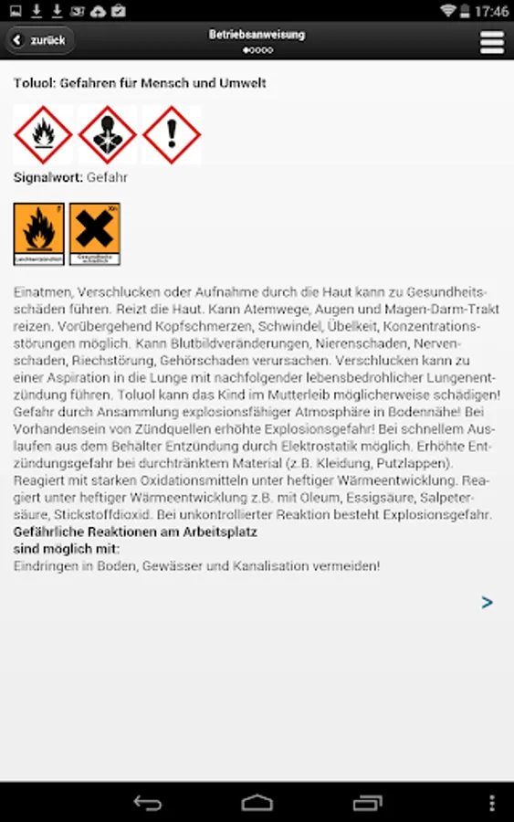 GisChem contains datasheets with numerous information on the safe handling of hazardous materials in the workplace. In addition to the hazards protection measures (eg, technical and organizational measures, personal protection measures, fire and explosion protection) are described and offered advice for. Example on the storage and disposal. There is also a maintenance instruction design for information of employees for each hazardous substance.