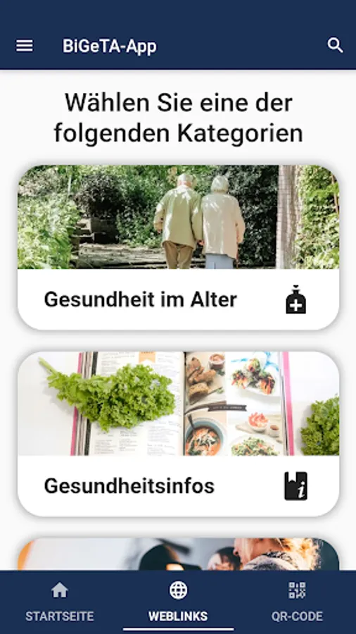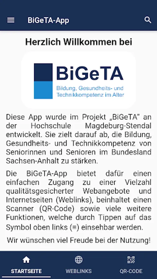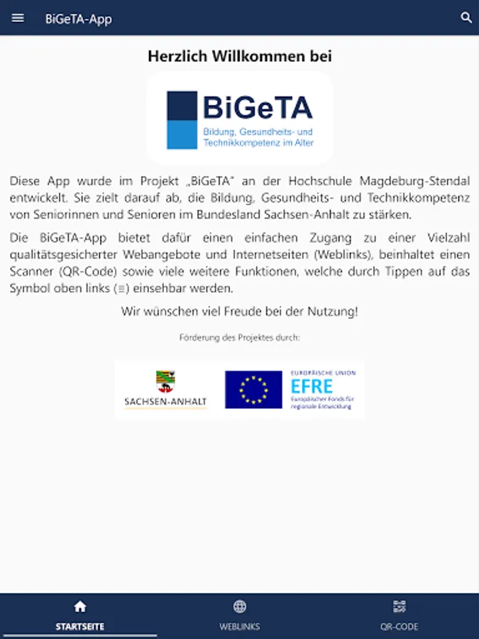 The BiGeTA app (education, health and technical competence in old age) was created in the research project of the same name, which is funded by the state of Saxony-Anhalt and the European Union and is located at the Magdeburg-Stendal University of Applied Sciences. One goal of the project was to create this app. For this reason the app is free of charge and without advertising!