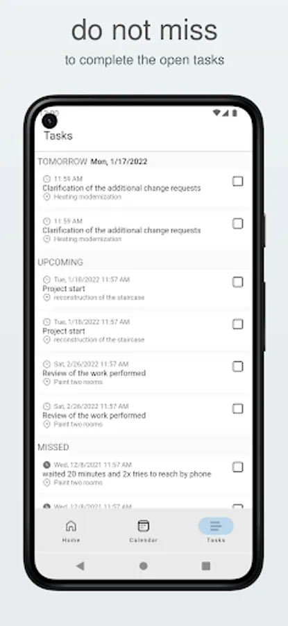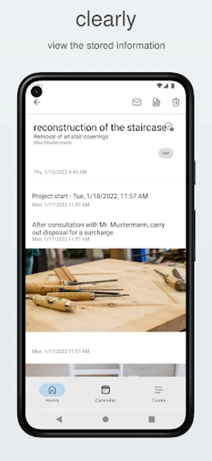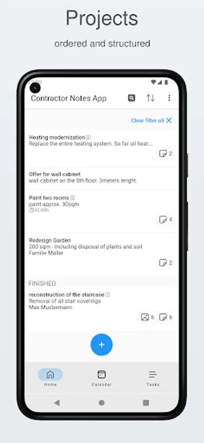 The free contractor notes app allows contractors to take notes and documentation with text and images. Pictures can be taken directly from the app and assigned to a specific project or customer visit. Also suitable for construction site documentation and as site diary.
