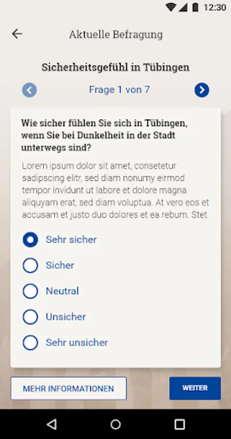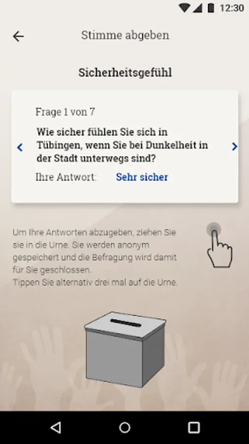 Participation in a survey is always voluntary and completely anonymous. The procedure is structured in such a way that no conclusions are possible, whether a person has participated and how he has answered the questions. The procedure for participation and evaluation of the surveys was agreed with the Commissioner for Data Protection and Freedom of Information of the State of Baden-Württemberg. In order to rule out manipulation, the Tübingen company SySS GmbH has carried out a multi-day safety test and remedied weak points. The BürgerApp has been certified in gold by the SySS GmbH.