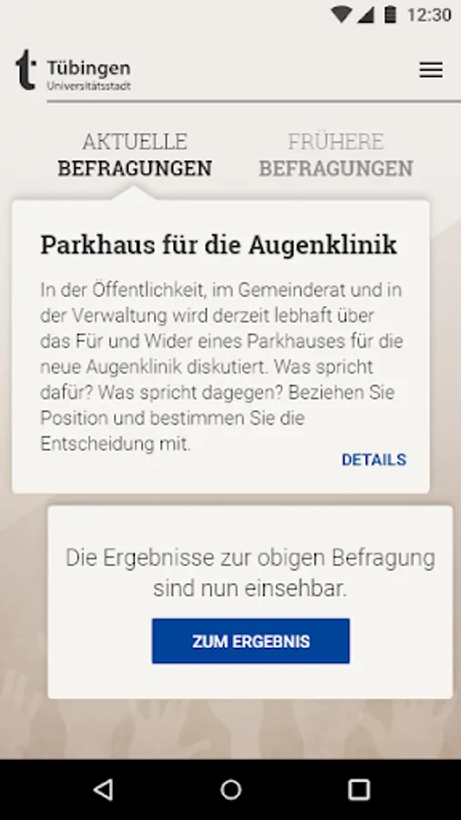 With the BürgerApp all inhabitants of Tübingen from the age of 16 can participate in the political decision-making on selected topics. The BürgerApp enables the municipal council to ask its residents for their opinion before deciding. Although the decision is made by the local council, the result of the survey gives the municipal council important information whether it is acting in the spirit of the people of Tübingen. If he does not, he must justify a deviant decision.