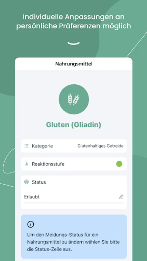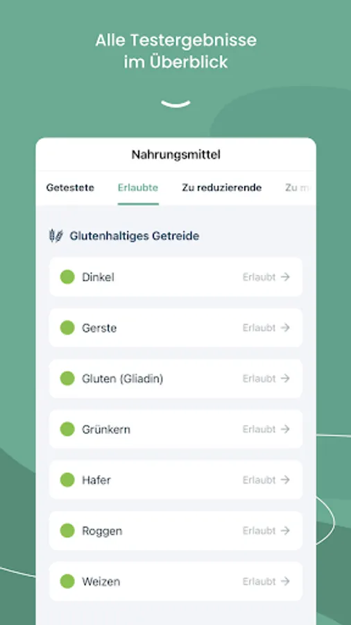 ► List of all foods tested in the BIOBALANCE test with presentation of your personal test result for the respective food.