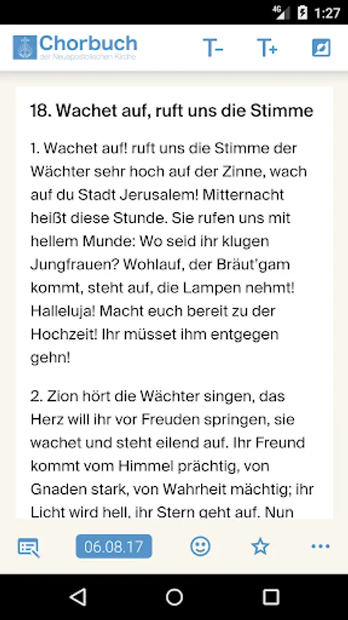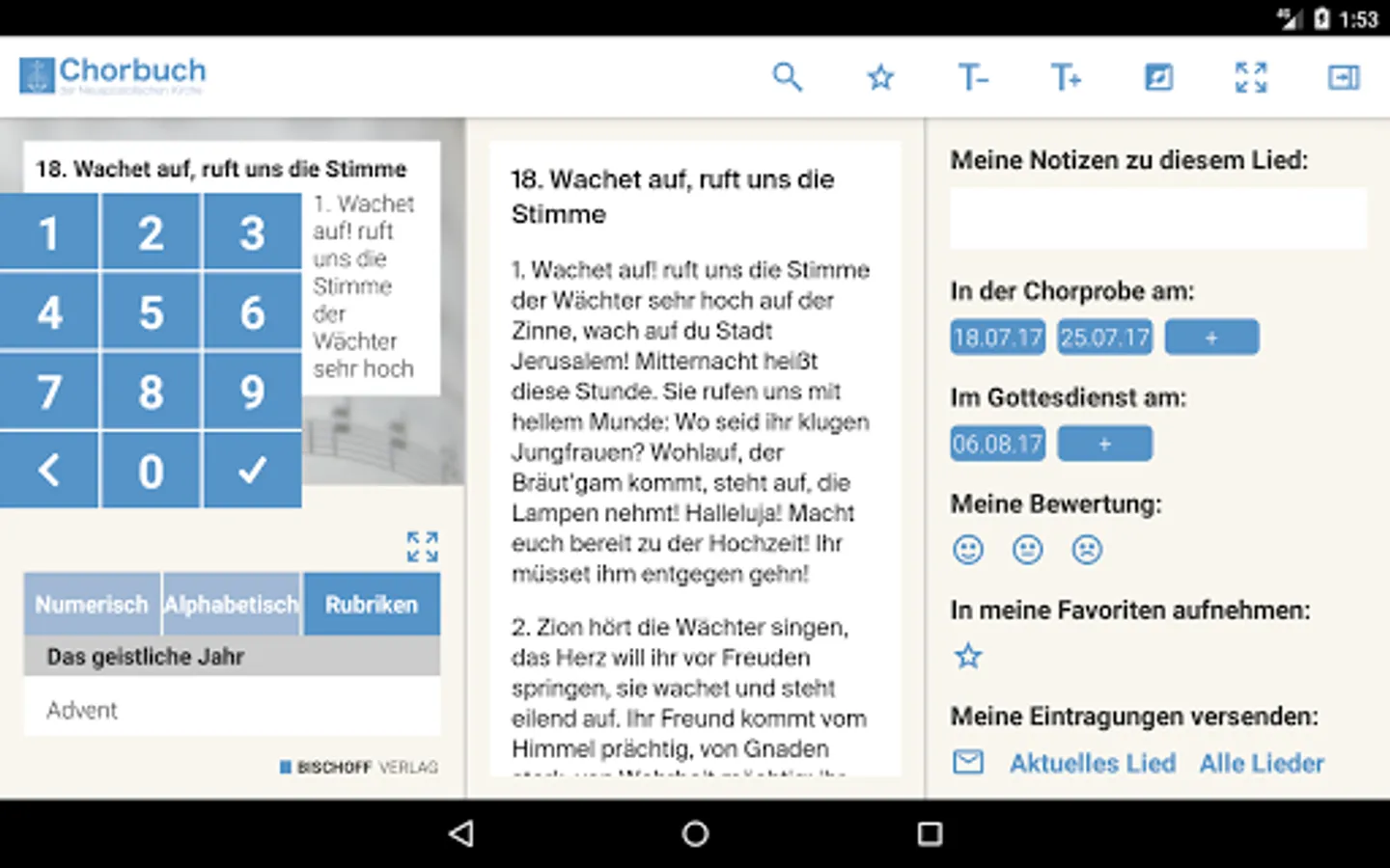 On smartphones found the song is touched, the full lyrics will open in a new window. The font size shown is a device-independent increases in each song text / are reduced (25 levels). In addition, the lyrics on request can negatively represent. The selected setting is maintained until you select a different font size / Appearance. If the smartphone held transversely with a small font size, the song text is displayed in full screen mode and the font size changes automatically in a slightly larger font size. The already larger display of Tablets contains all information about a song together with the number / search section comfortably on one side only. In tapping the lyrics will open in full screen mode.
