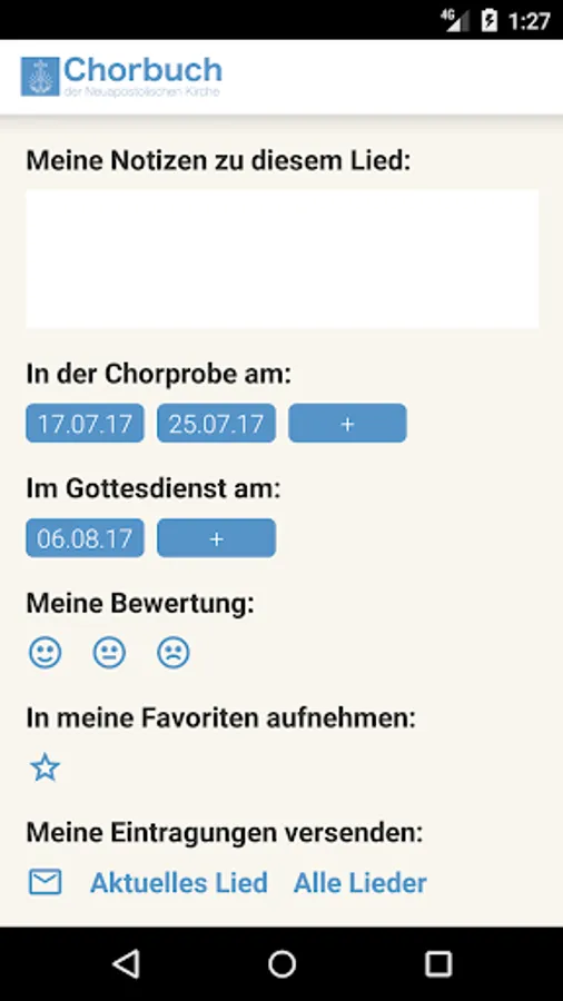 - enter appointments of choir practice and worship, in which the song was sung (or should be)