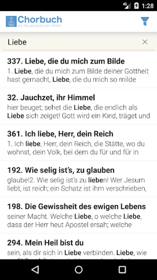 The home page now displays next to the field for the number entering the first lines of text of the desired song. Alternatively, songs about the search section or the full-text search can find. By default, the search also finds parts of words and not considered in several words the order. The exact search in quotes, for example. B. "The Lord is" on the other hand provides only sites with exactly matching letters within the quotation marks. Search result lists can be sorted by relevance or numerically.