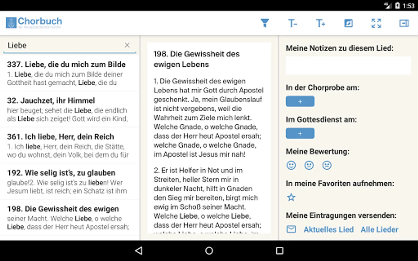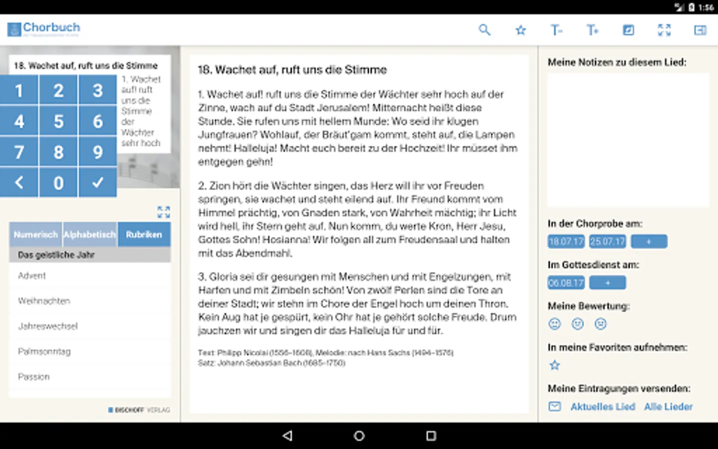 The choir book app offers all those interested in music, conductors and service managers the ability to look up the lyrics from the choir book quickly and easily.