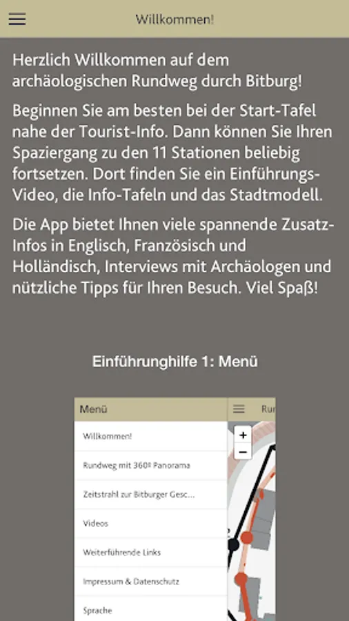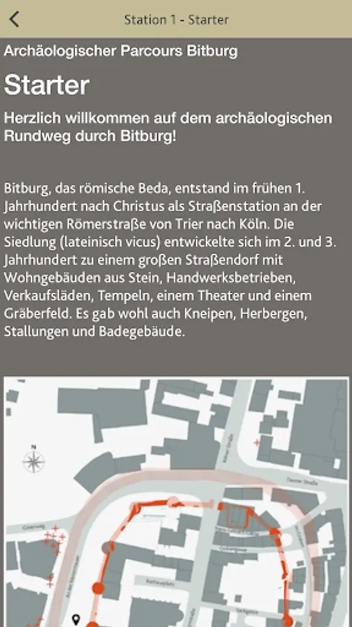 Our course gives you in 11 stations insights into the historical development of Bitburg (Roman Beda) from the early Roman Vicus to the late Roman Castrum. You will walk through the Roman and medieval history of the town of Bitburg along the castle wall with the partially preserved walls and towers.