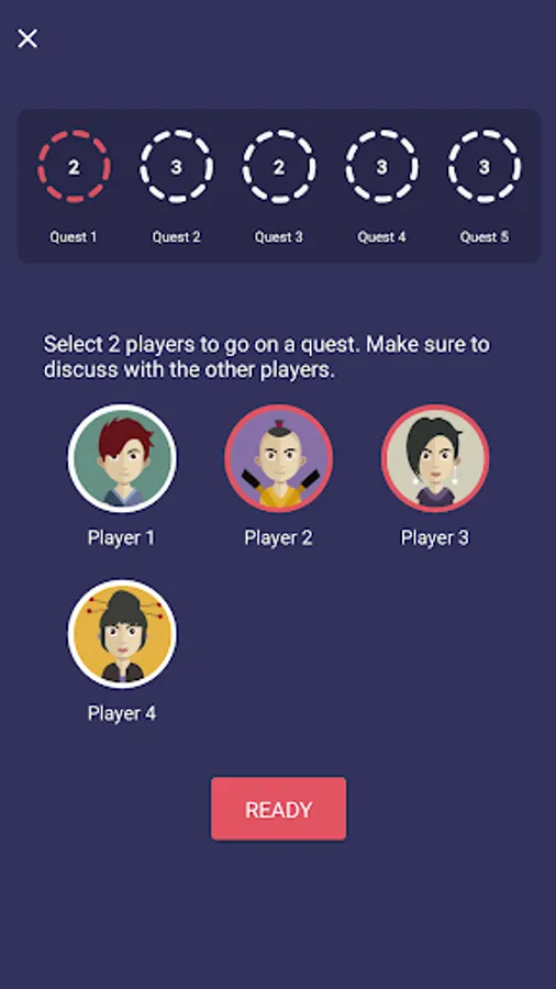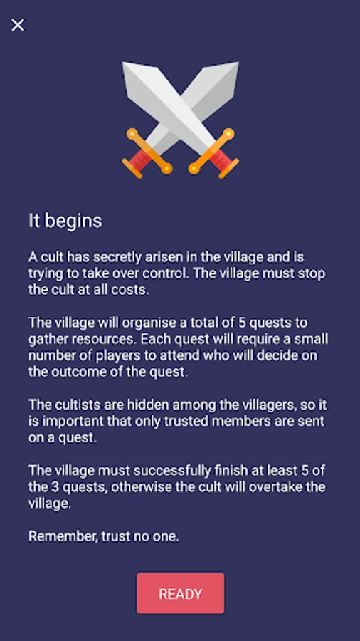 The game is divided into 5 rounds. Each round a new leader will select players to go on a quest. Players that go on a quest can decide if this quest should be successful or fail. To win the village must complete at least 3 quests successfully.