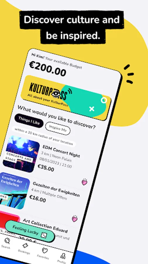 By selecting preferences during registration, you allow the app to make offers that suit your particular tastes and interests. You can also search for specific offerings. If you don’t find anything to your liking, you can get suggestions from the KulturPass via “Inspire Me”. Or take pot luck by choosing “Feeling Lucky” and maybe experience something completely new!